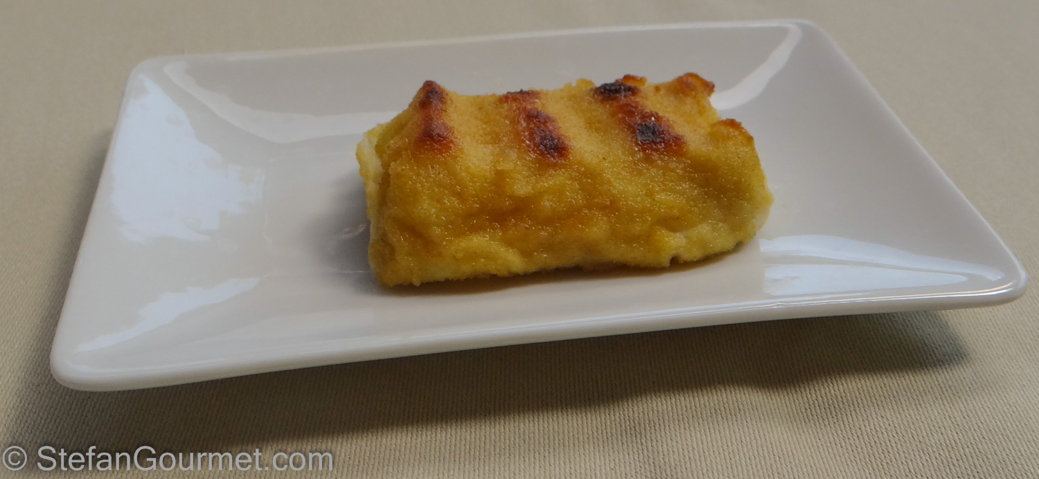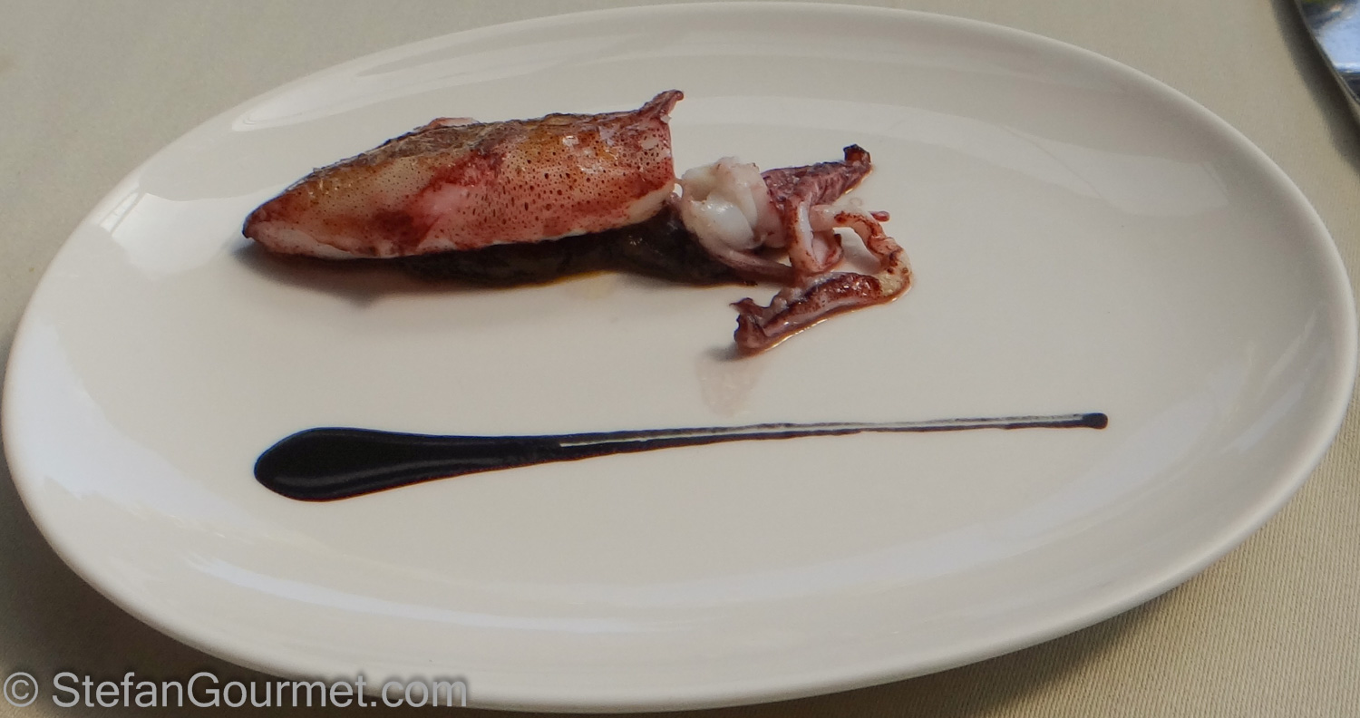 The first ‘course’: a chicken croquette. What’s special about it compared to the croquetas you’ll find as tapas all over Spain is that this one was cooked on the grill. Nice with a very delicate chicken flavor. 8/10