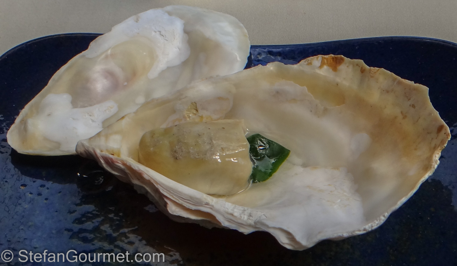 The oyster was cooked and served with a single leaf of spinach. 8/10