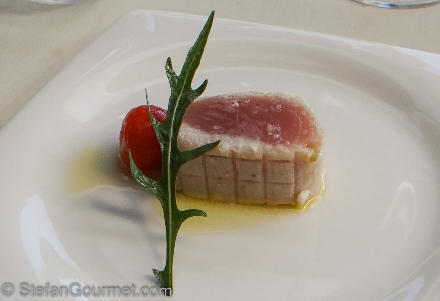 White tuna with tomato. The tuna still rare inside and the tomato was skinned. Served with very good olive oil. 9/10