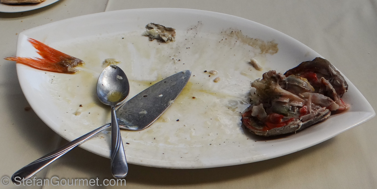 We shared a red sea bream between the four of us. It was grilled with just a bit of fresh herbs, garlic, salt, and olive oil. The fish was exceptionally fresh and cooked just right. An important touch was that the fish was served on warm plates.