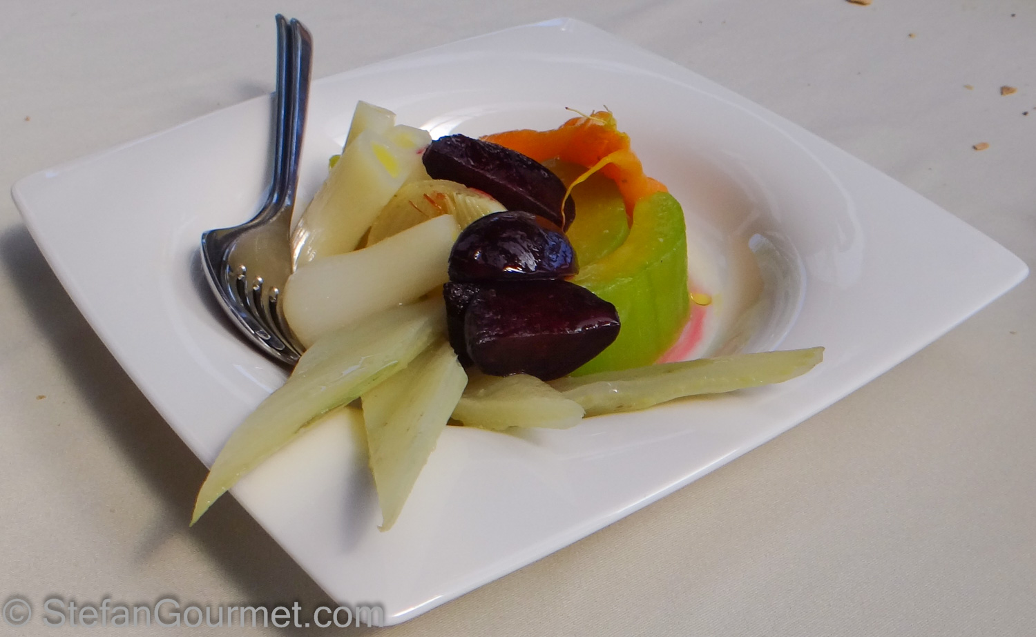 The fish came with steamed seasonal vegetables: leeks, fennel, beetroot, carrots, onion, and some kind of squash.  9/10