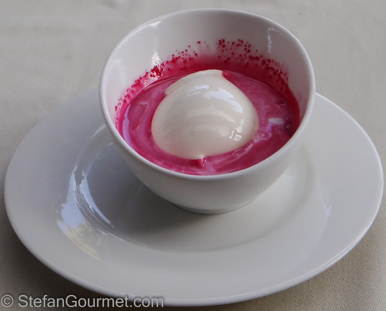 The first dessert: reduced milk ice cream with beetroot juice. A good combination of flavors, very nice. 9/10