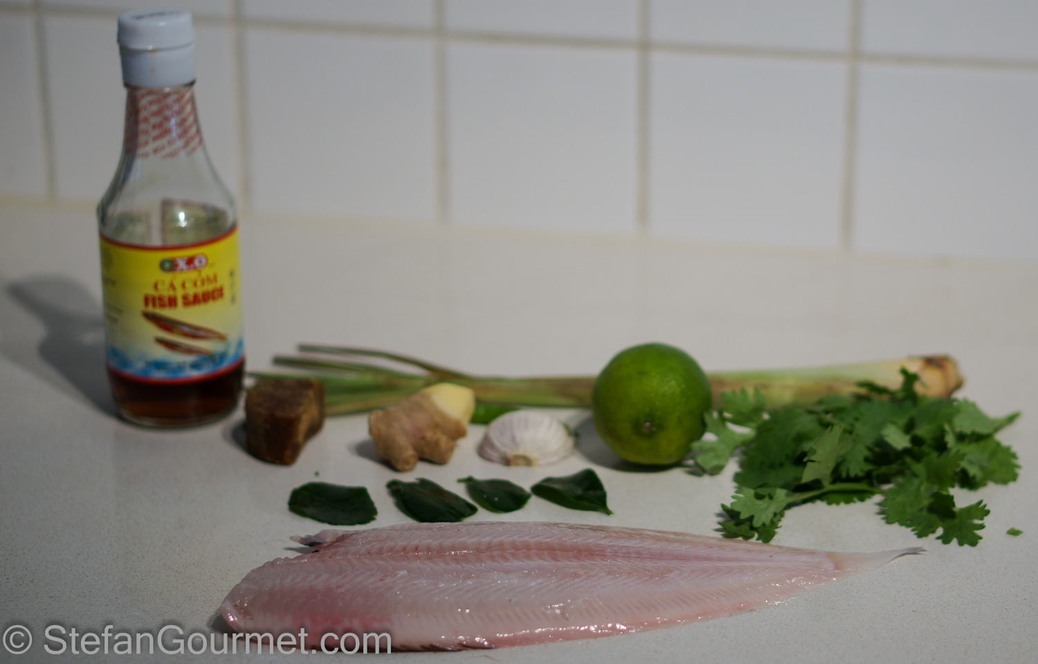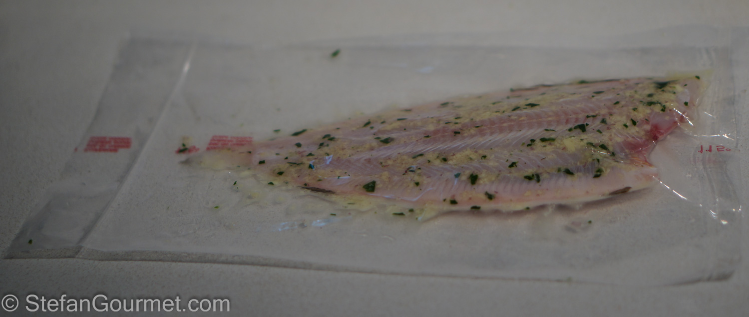 In this cases I cooked a baby sole with Thai flavors, and served it with a Thai dressing. Since I used a whole sole with the bones still in, I cooked it at 50ºC/122ºF to make it easy to get the fish off the bones. For sole fillets a lower temperature would be sufficient. It was easy and delicious, and done in 20 minutes. Here’s what I did…