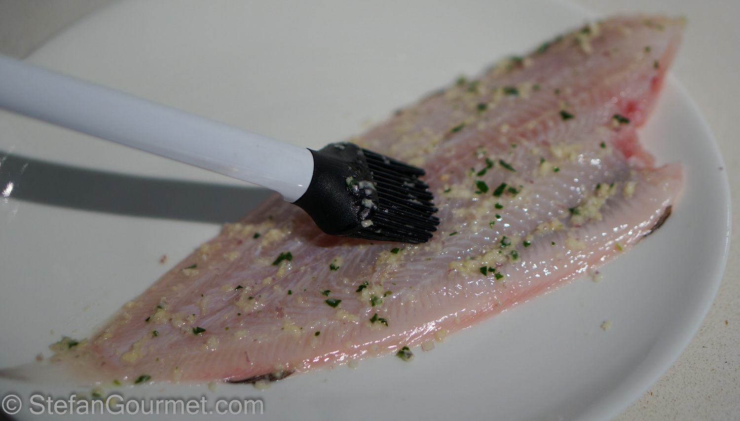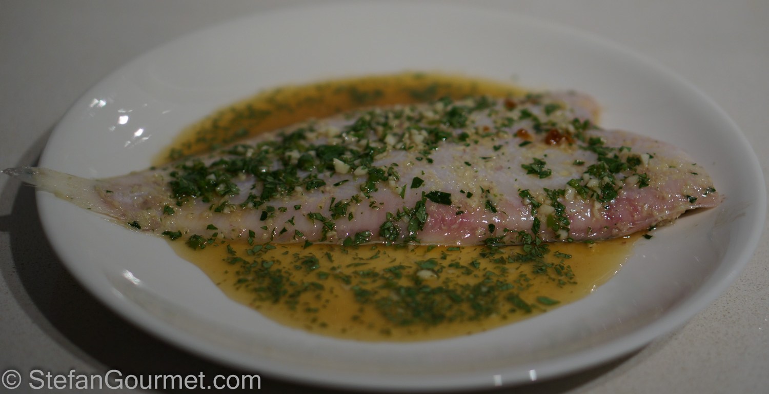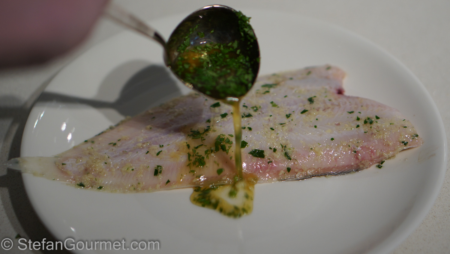 When the sole is cooked, put it on a preheated plate and pour over the dressing. Because of the low cooking temperature and dressing at room temperature, preheating the plates is very important.