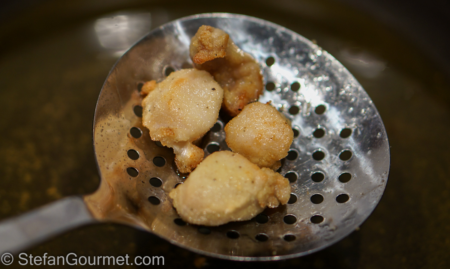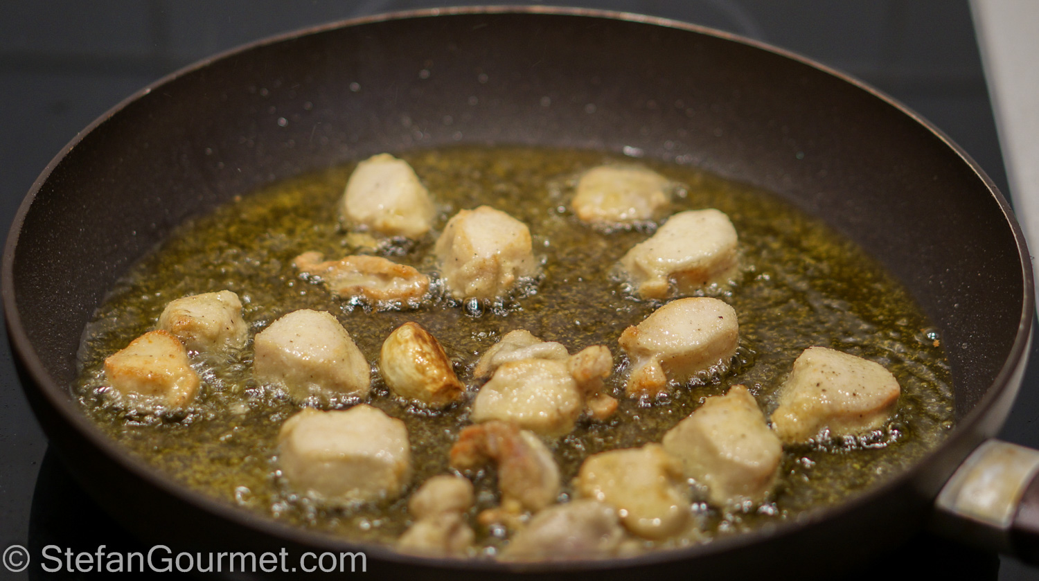 Cut the rabbit into cubes, season with salt and freshly ground black pepper, and dust them with flour. Use semolina flour if you have it, as it provides a nicer crust. Brown the rabbit quickly in the hot oil until the rabbit pieces are lightly golden. The rabbit does not have to be cooked through at this point, as it will continue to cook from the residual heat while it rests.