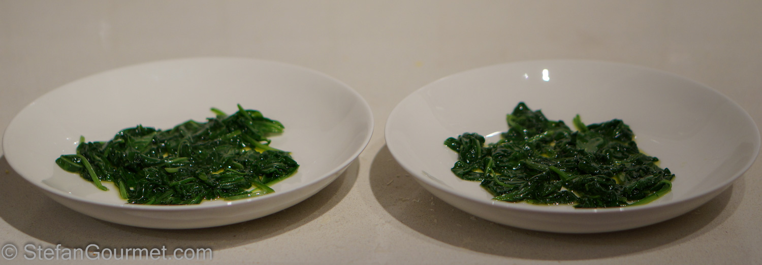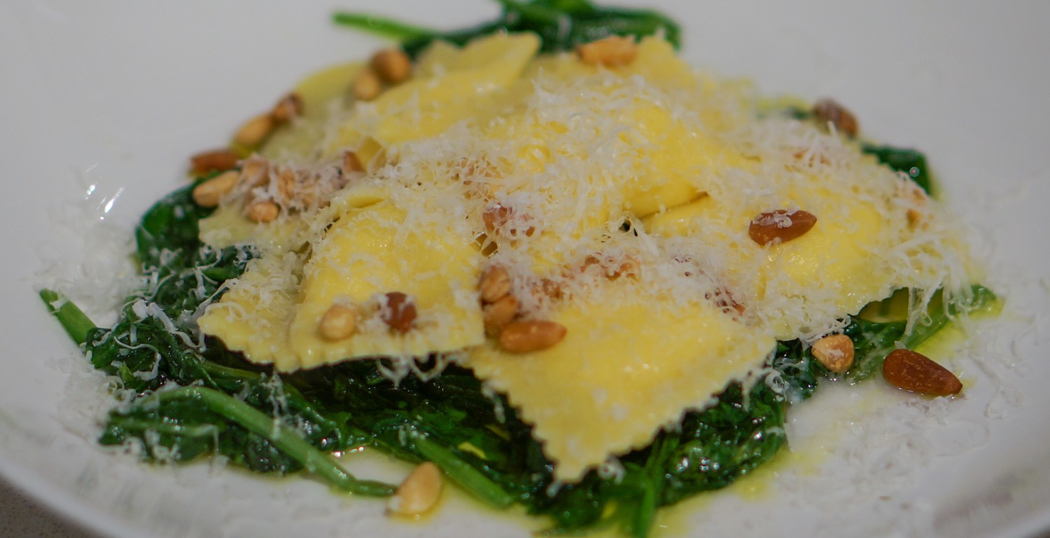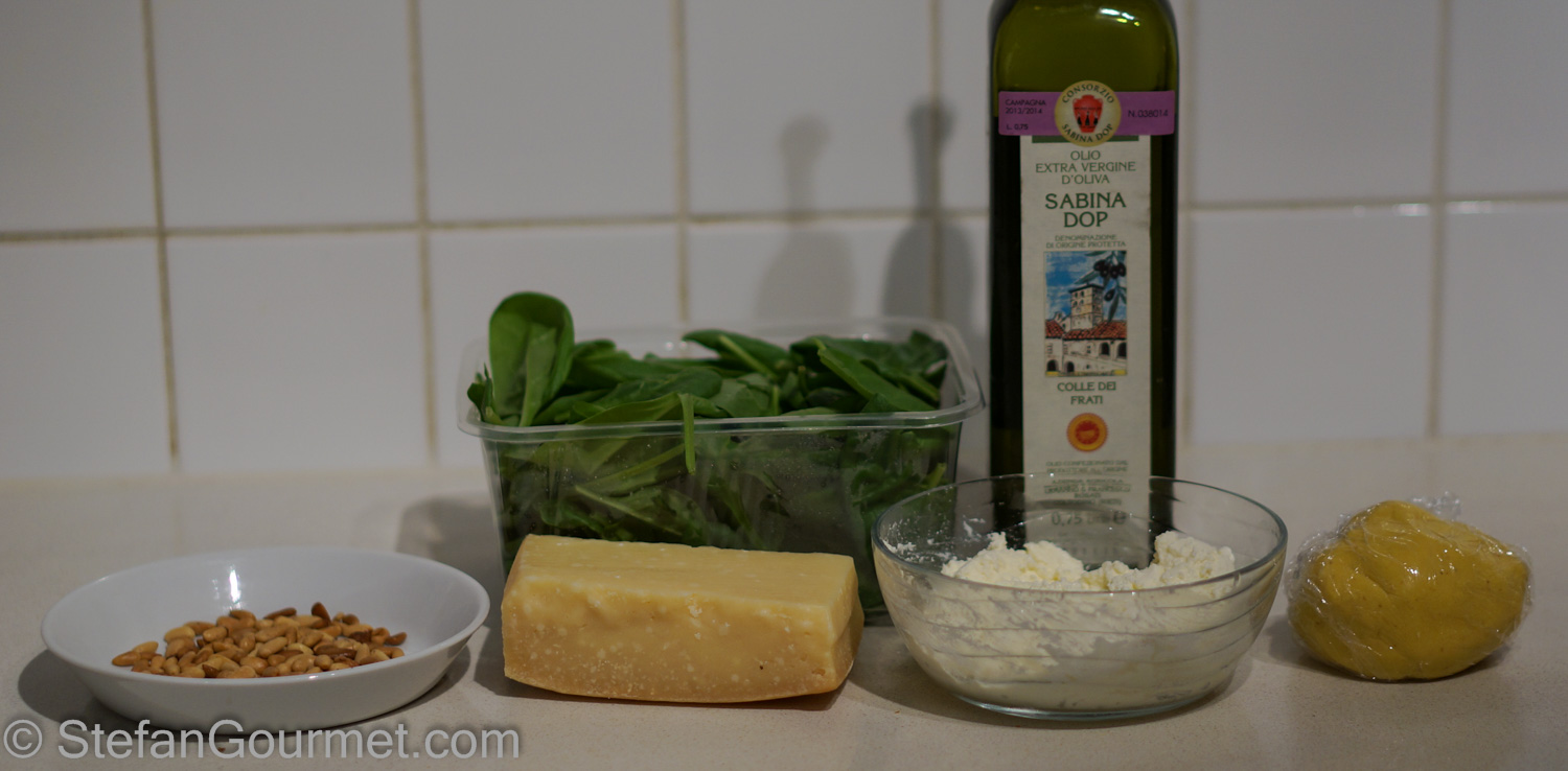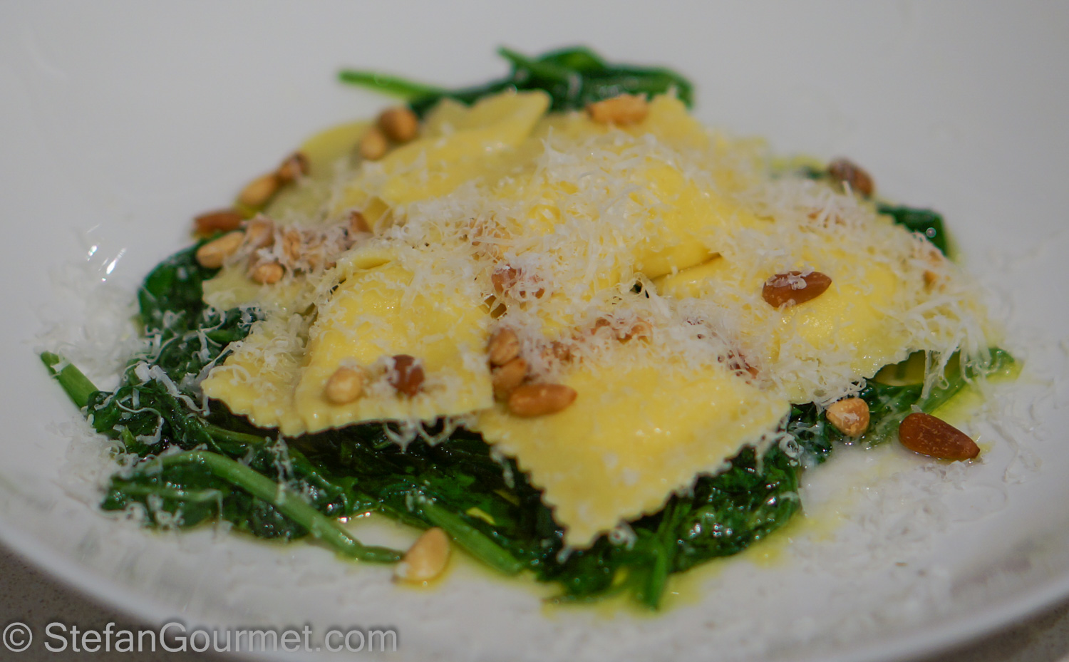 In 2007 during our first wine discovery tour through Italy, we visited Castello di Brolio in Tuscany and had dinner at the restaurant that was part of the winery. They served a tasting menu to showcase their wines, and with the Chianti Classico they served ravioli stuffed with ricotta and pecorino, garnish with sauteed spinach and toasted pine nuts. This is a variation on the Italian classic of ravioli stuffed with ricotta and spinach, and it really showcases the cheese that is included with the ricotta in the ravioli stuffing. Instead of pecorino, you can also prepare them with any other cheese. With a matured cow’s milk cheese such as pecorino or parmigiano, it does indeed pair very nicely with a Chianti Classico. Personally I prefer this with sauteed ‘wild’ (coarse) spinach, which is sweeter and retains more texture than sauteed baby spinach. (But in this case I only had baby spinach.)