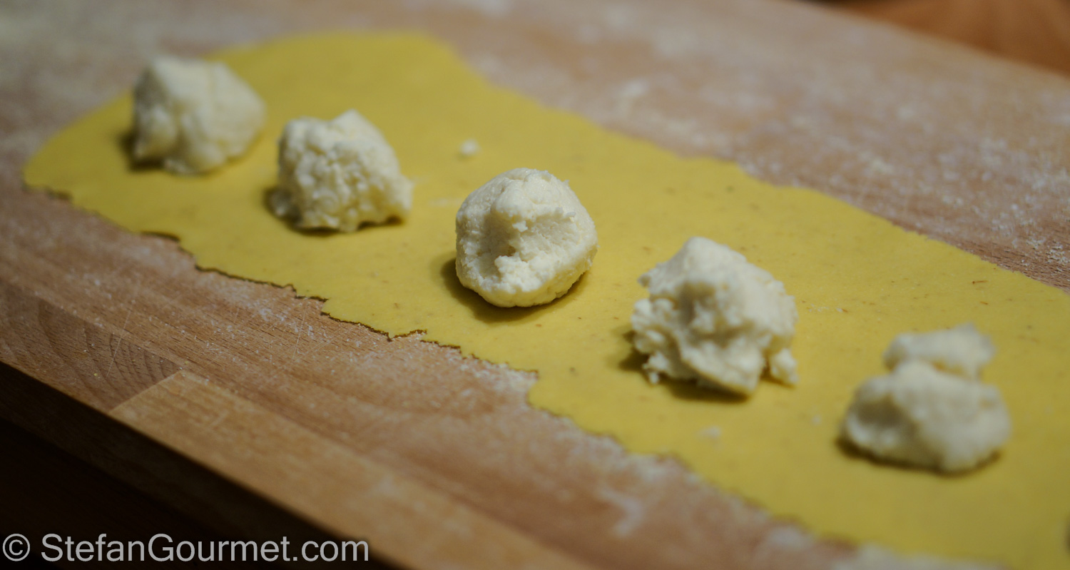Put teaspoon-sized heaps of the stuffing on the sheet of pasta with about 2 cm (.8″) in between, not in the center but on one side of the center.
