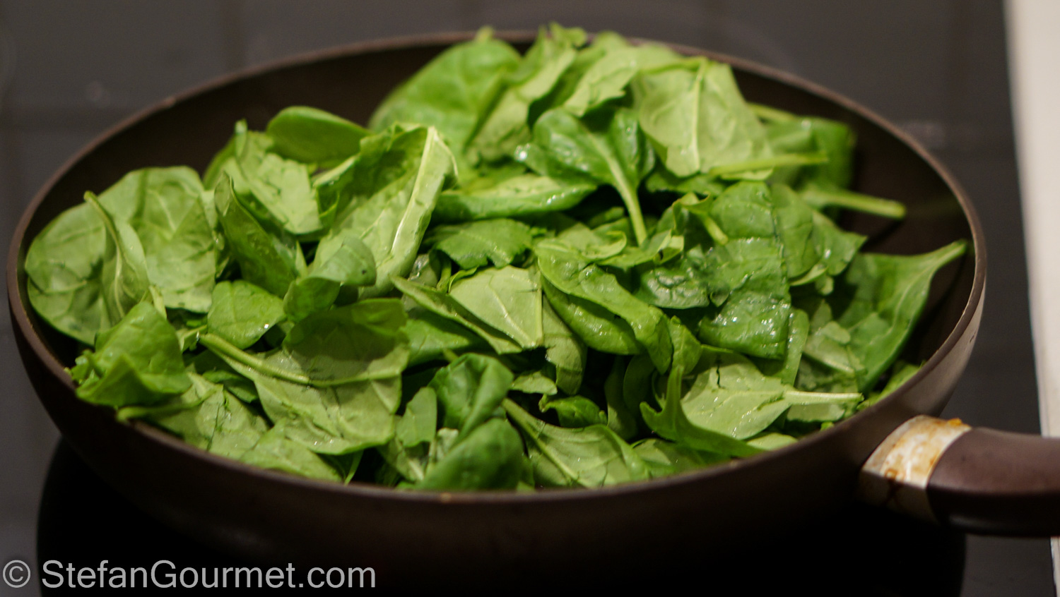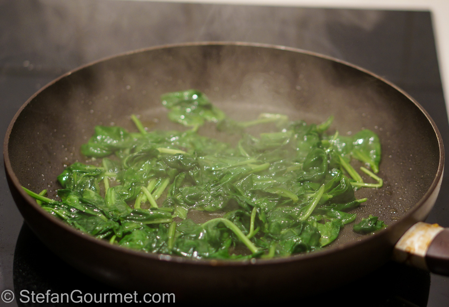 Bring a large pot of water to a boil. Heat some olive oil in a frying pan and add the spinach.