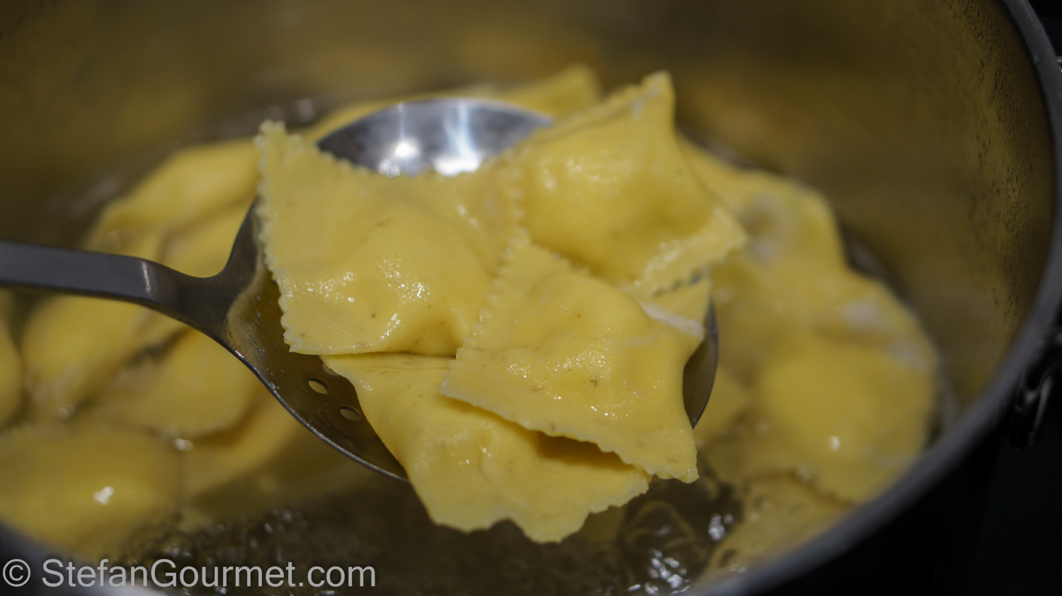 Cook the ravioli for a couple of minutes, then take them out with a slotted spoon and transfer them to the plates with the spinach.