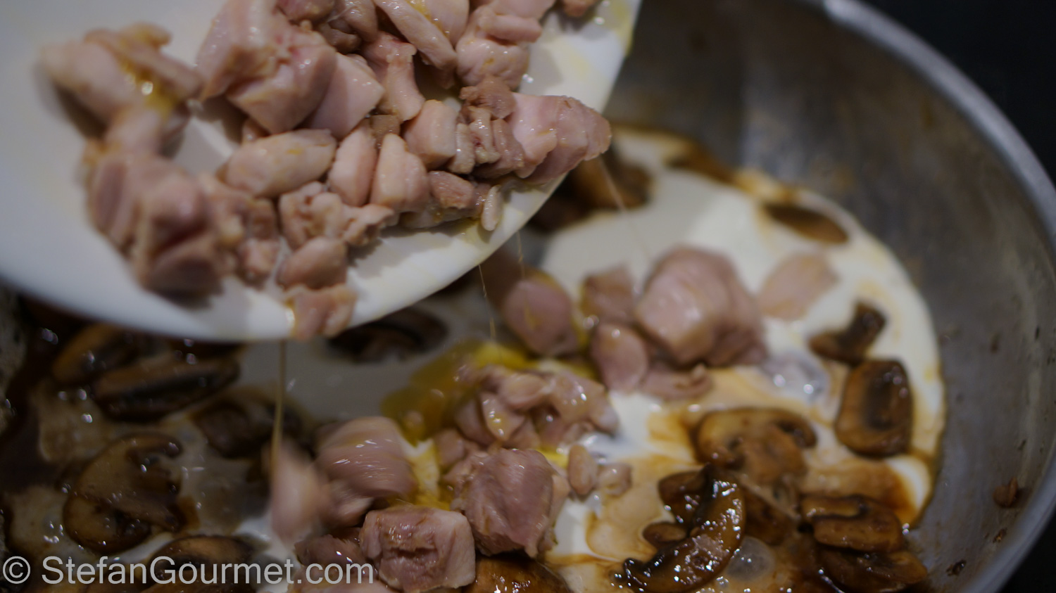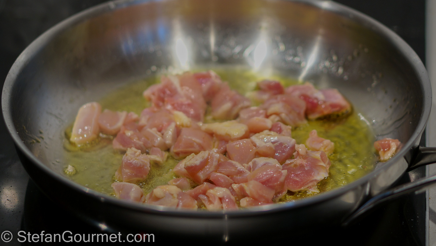 Season the diced chicken with salt. Brown the chicken in some olive oil in a frying pan over high heat.