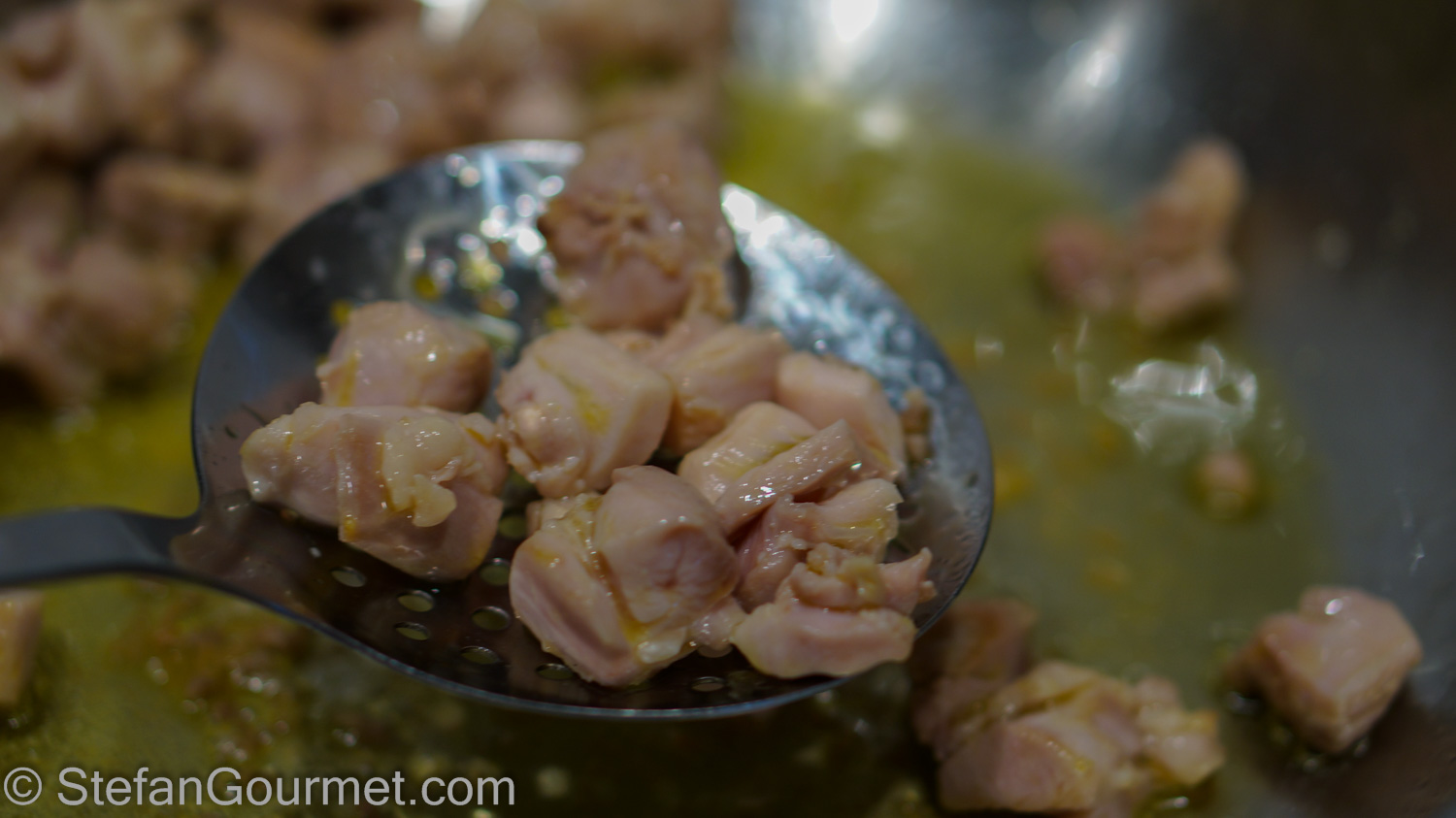 Remove with a slotted spoon as soon as the chicken has lost its pink color on all sides and set aside.
