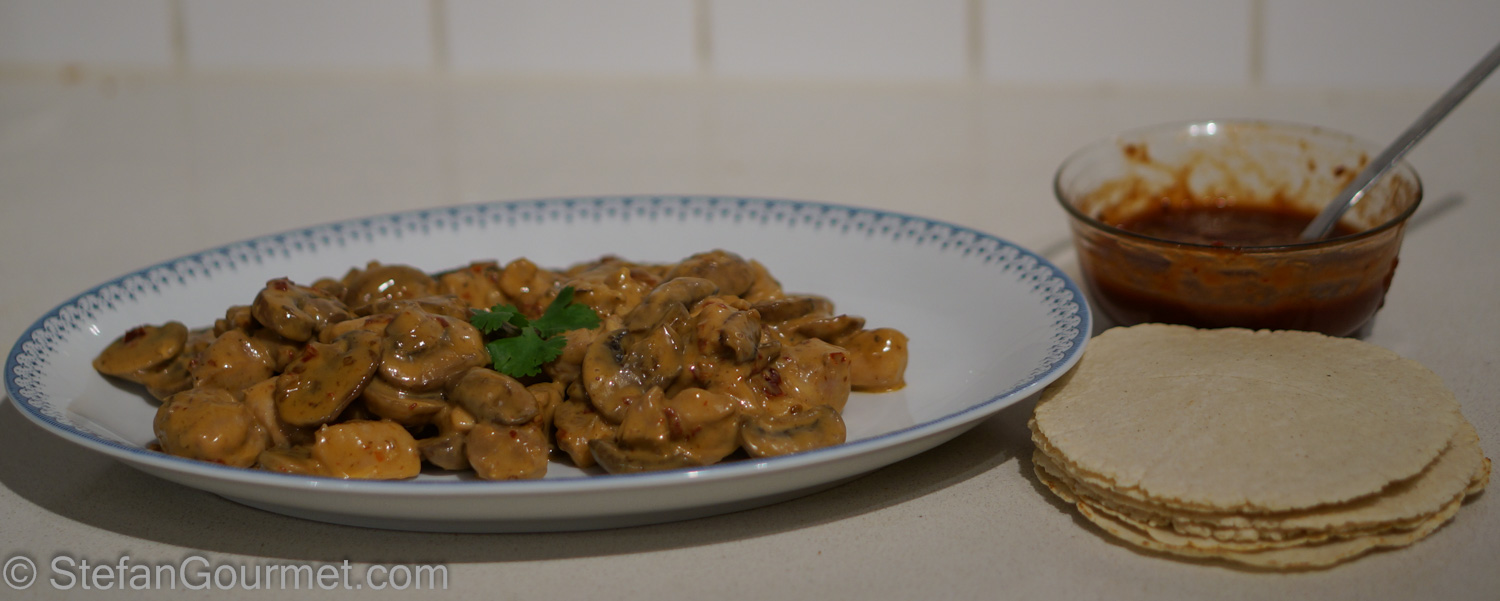 I found similar recipes on Mexican websites that included chicken stock cubes as well and use canned mushrooms. I decided to leave out the mayo and include concentrated homemade chicken stock to boost the chicken flavor. It goes without saying I used fresh mushrooms. I also prepared some homemade corn tortillas to serve this with (flour tortillas are not Mexican and corn tortillas are easier to make). I was very happy with the result and thought it was creamy enough without the mayo. The chicken stock did really boost the chicken flavor. The combination of chicken with mushrooms, cream, and the spiciness of the chipotle in adobo is delicious and has many layers of flavor. You can make it as spicy or as mild as you like by changing the amount of chipotle. This is a very easy dish that is absolutely wonderful and that I will definitely make again. Here’s what I did…