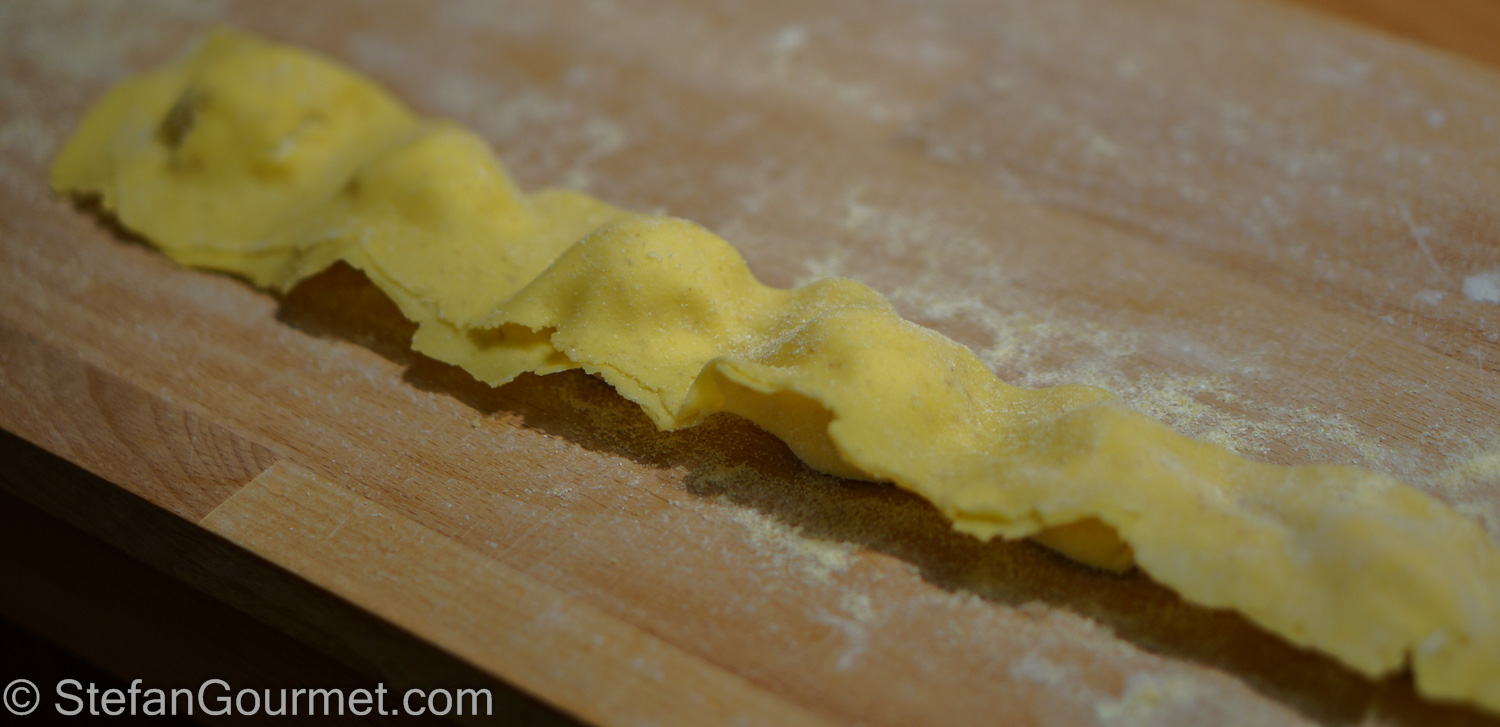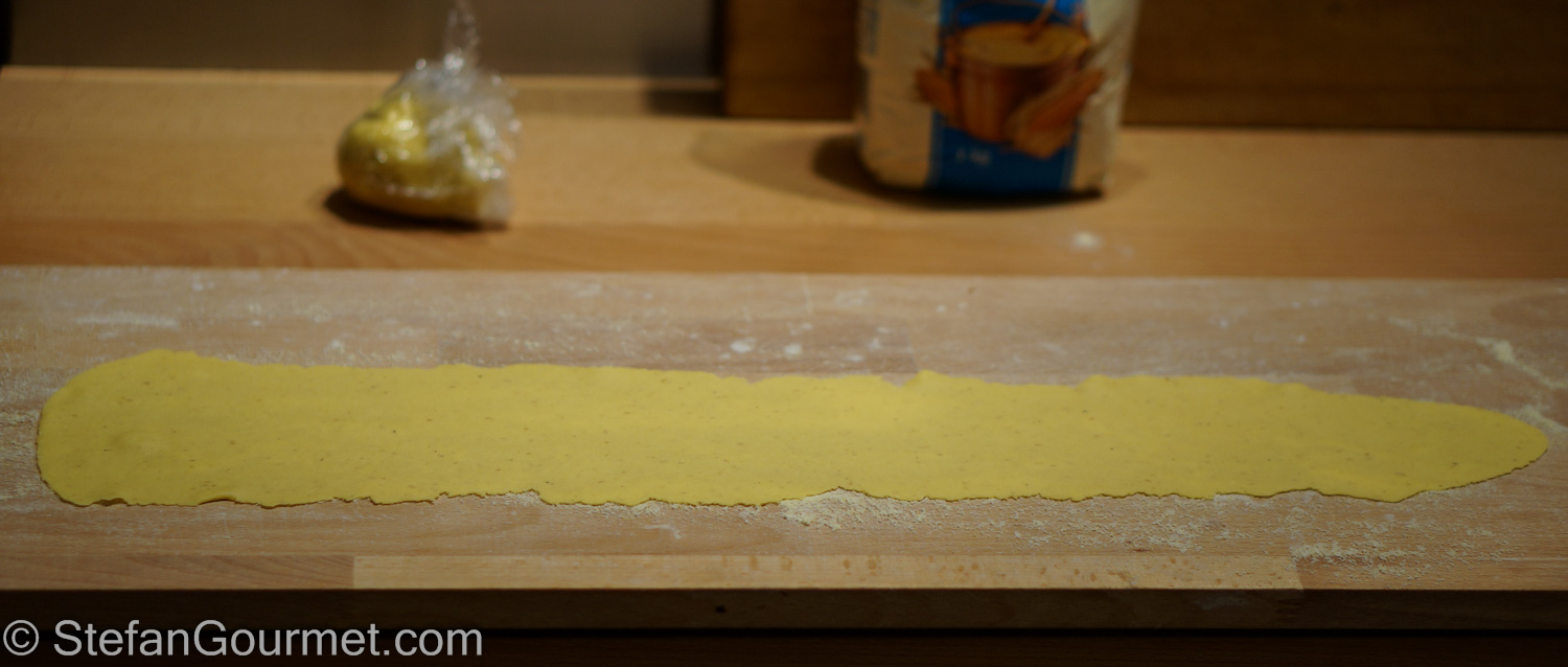 As you can see in this picture, the dough is not as strong, flexible and elastic as regular fresh pasta dough, but by handling the dough carefully I could still shape the ravioli. It takes some getting used to the fact that the dough won’t stretch at all — it will just break when you don’t handle it carefully. On the other hand it does keep a shape much better and doesn’t retract back like dough with gluten.