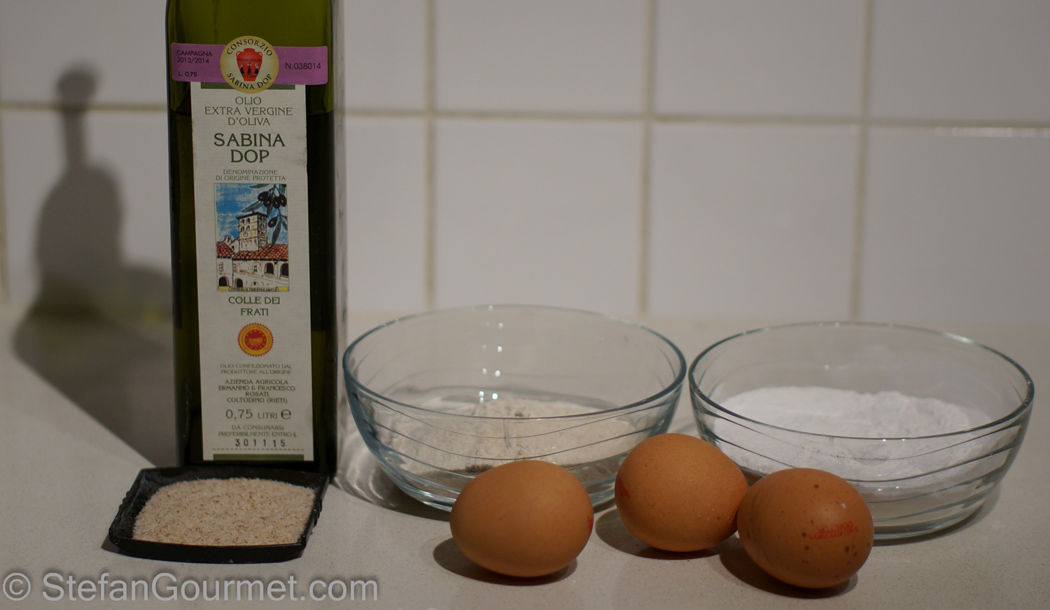 I tried to make the second mixture lighter in flavor and texture by replacing the polenta with wholemeal rice flour. This recipe was 1 egg, 2 egg yolks, 75 grams white rice flour, 75 grams full rice flour, 1 tsp extra virgin olive oil, 1 Tbsp of psyllium husk, and water as needed.