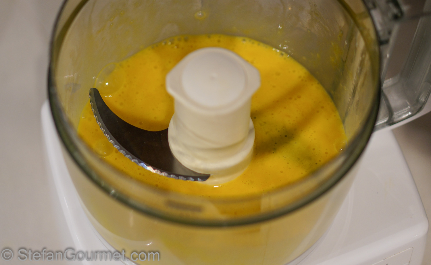 Use either a stand mixer (fitted with the paddle attachment) or a food processor, and first beat the egg(s) and egg yolk(s).