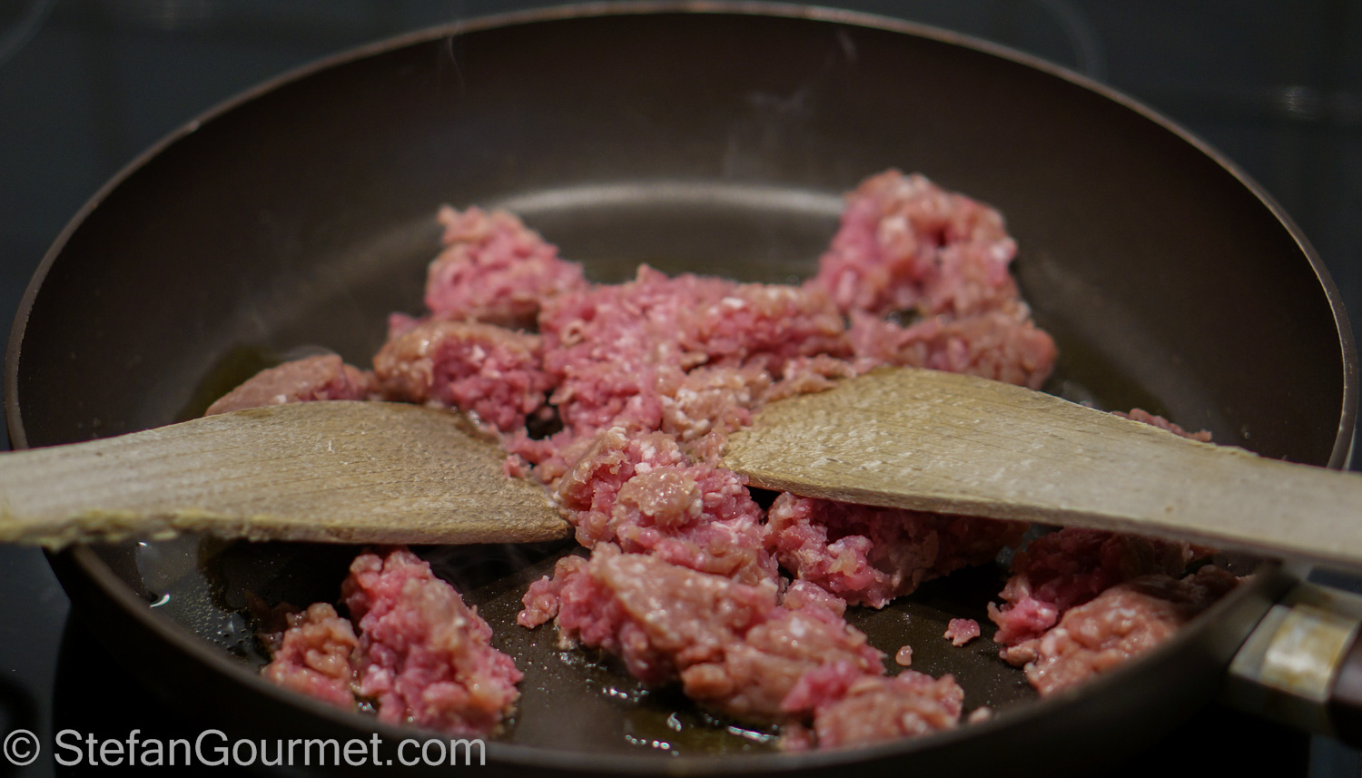Meanwhile, cook the ground pork in a non-stick pan (no oil required as the meat will release its own fat), using two wooden spatulas to break up the meat.