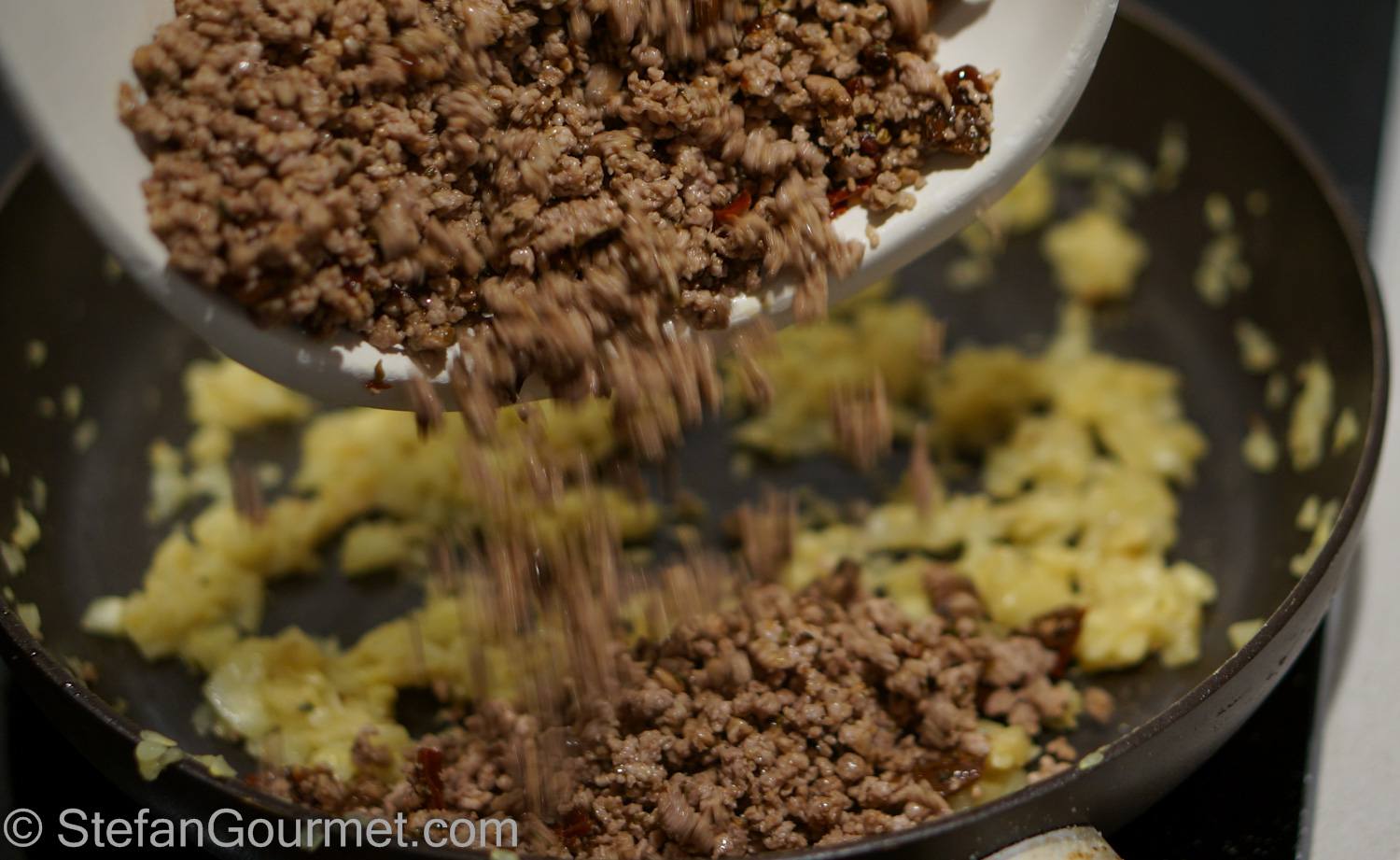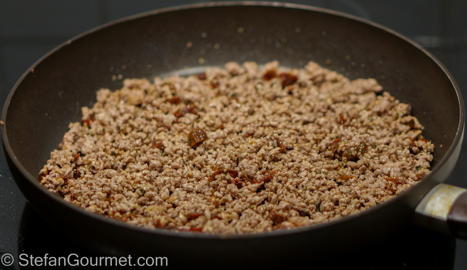 Turn off the heat. Add the meat to the zucchini, and stir to mix.