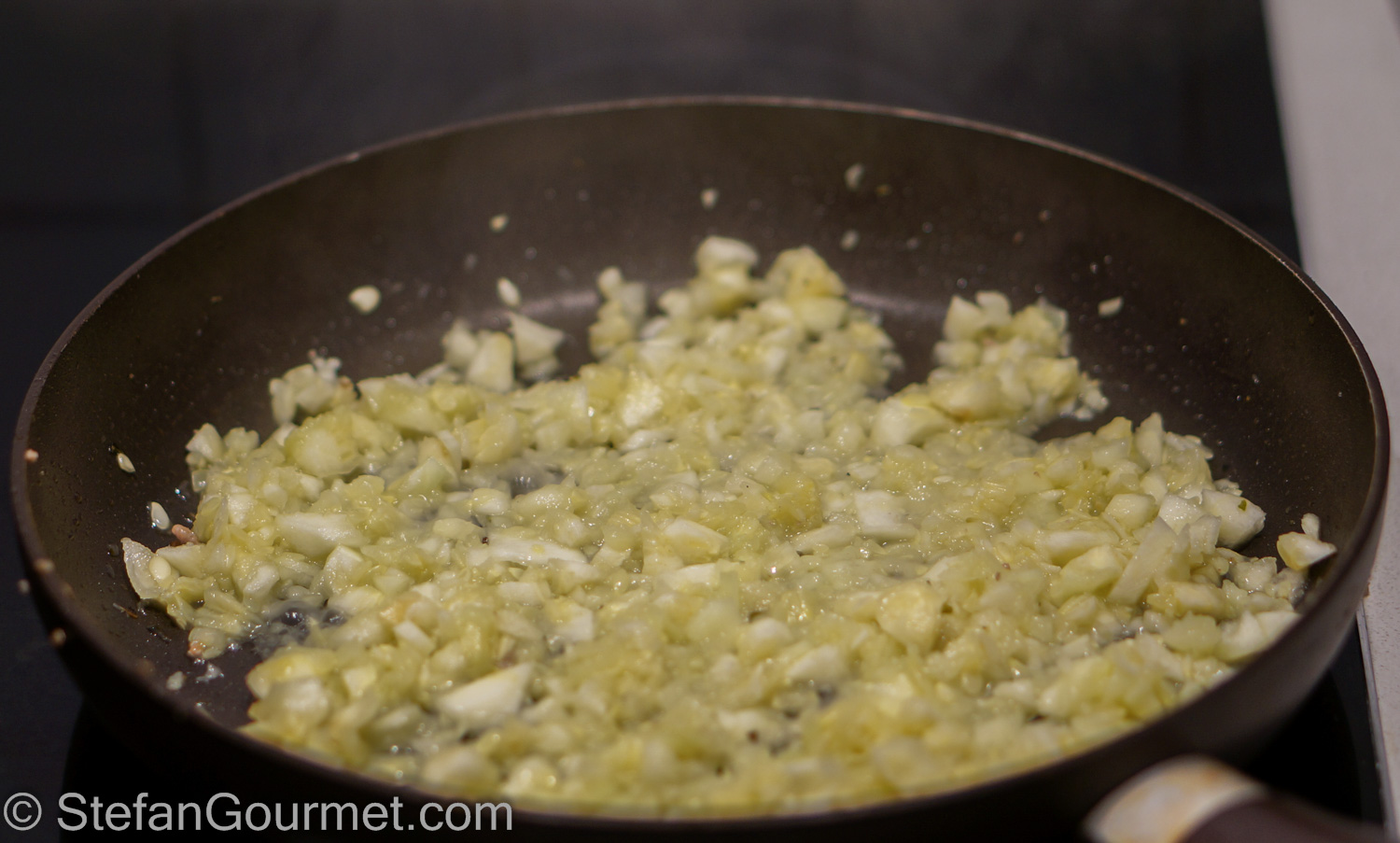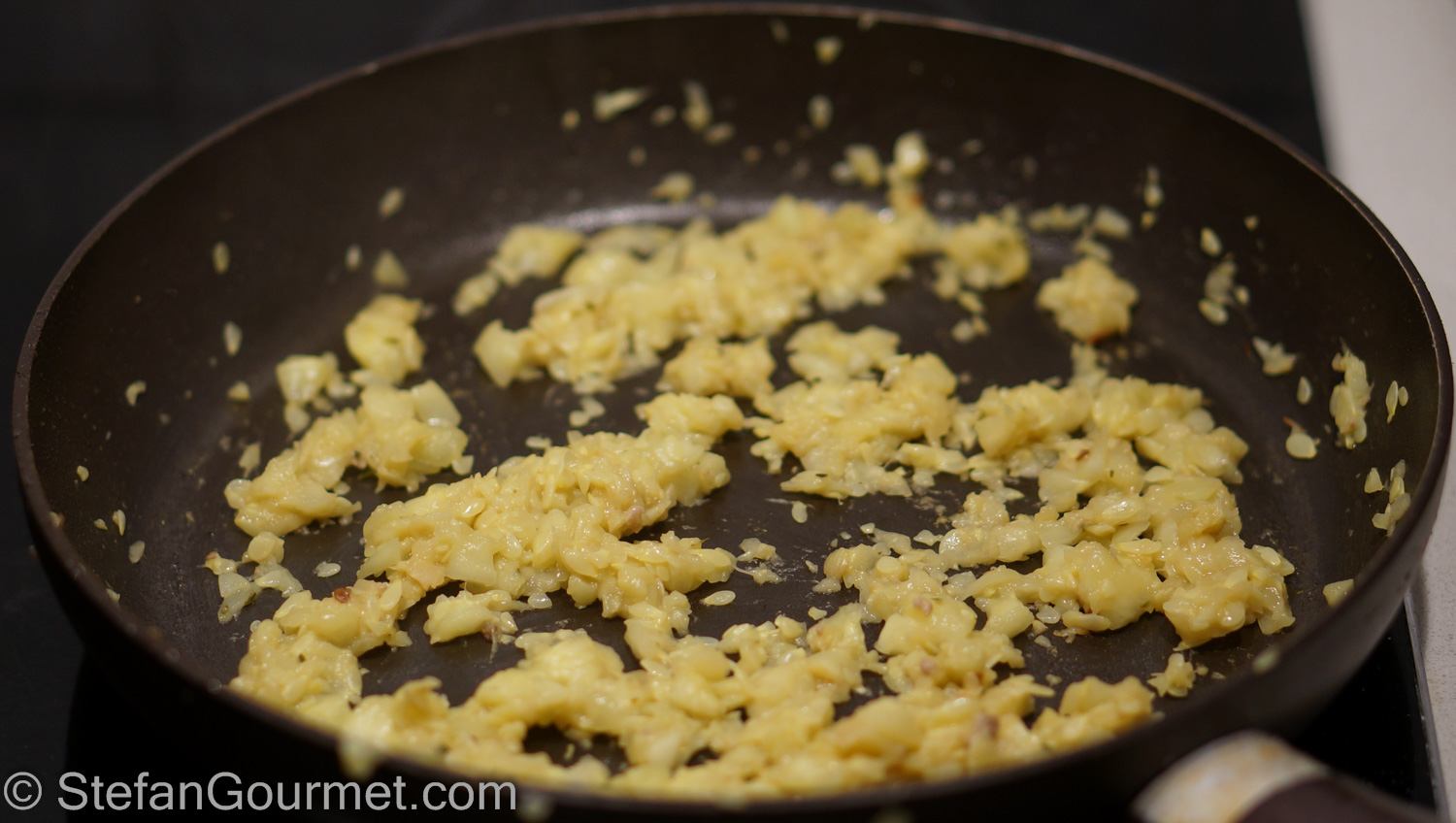 Heat a bit of olive oil over high heat in a non-stick pan and add the chopped zucchini flesh and seeds.