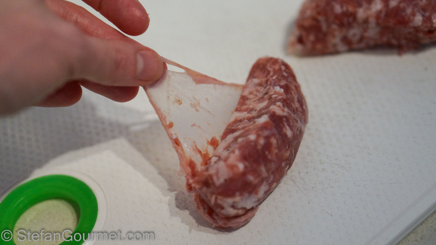In the meantime, prepare the ragù. Start by taking the sausage out of its casing, and mince the sausage meat.