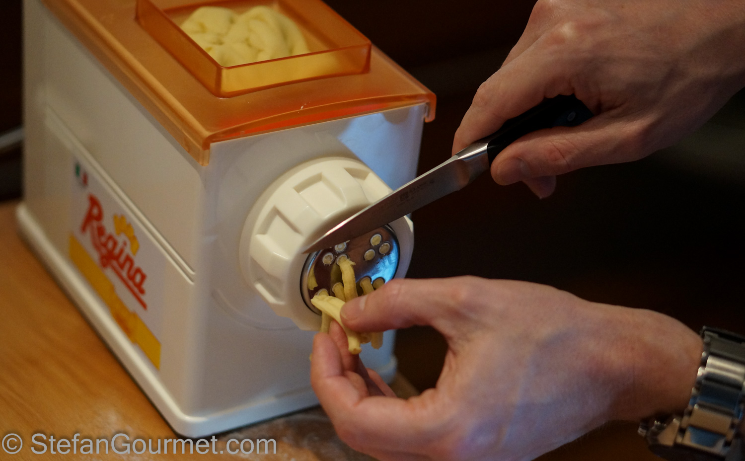 The gramigna should be about 5 cm (2 inches) long. I found I got best results by extruding 5 cm of dough, cutting off the individual gramigna, extruding another 5 cm, etc.