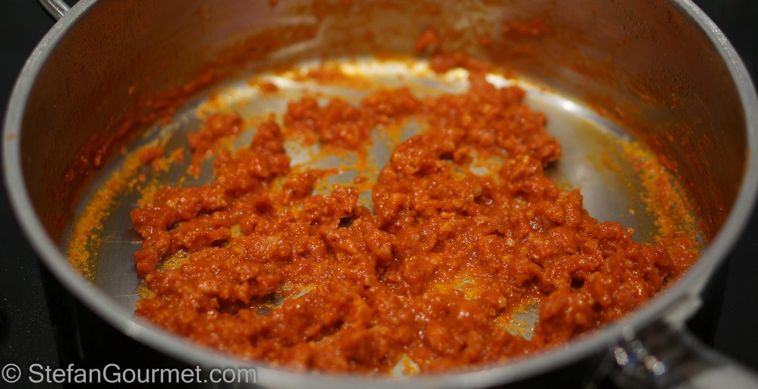 Simmer, uncovered, stirring now and then, until the sauce has a nice thick consistency. Once it is finished, taste and adjust the seasoning with salt if needed. Keep the sauce warm over very low heat. Add a bit of water if it becomes too dry.