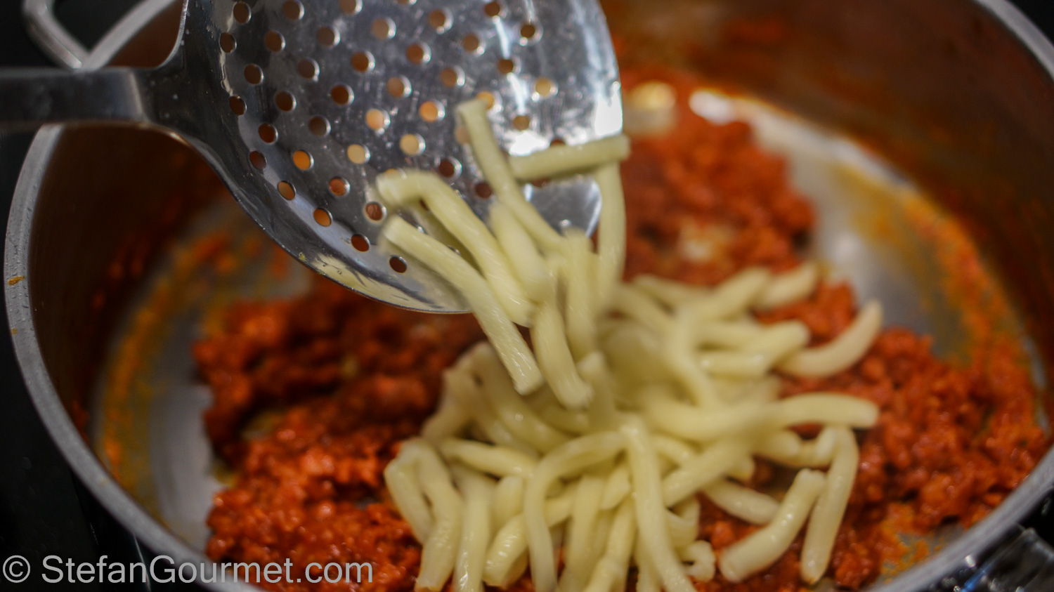 Bologna is famous for being the food capital of Italy. The best-known pasta dishes from Bologna are tagliatelle (not spaghetti!) alla bolognese and lasagne alla bolognese, both made with fresh egg pasta and the famous ragù alla bolognese. Being the food capital of Italy, those are by far not the only typical pasta dishes from the city. Another example that I covered on this blog is tortellini in brodo. But also gramigna al ragù di salsiccia is a classic from Bologna. In its basic form the ragù only has three ingredients: sausage, tomatoes, and wine. Gramigna are short hollow tubes of pasta, made with an extruder. It is absolutely delicious in its simplicity.