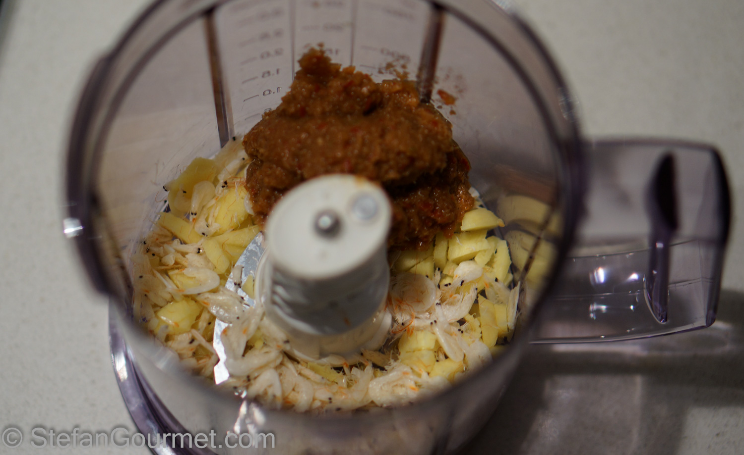 Combine the red curry paste with the dried shrimp and ginger in a blender. (You could also use the more traditional pestle and mortar.)