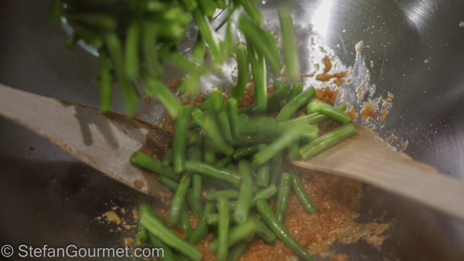 Stir fry until the green beans are starting to get tender. This takes about 15 minutes and you will have to add a bit of water now and then as otherwise the curry paste will burn.
