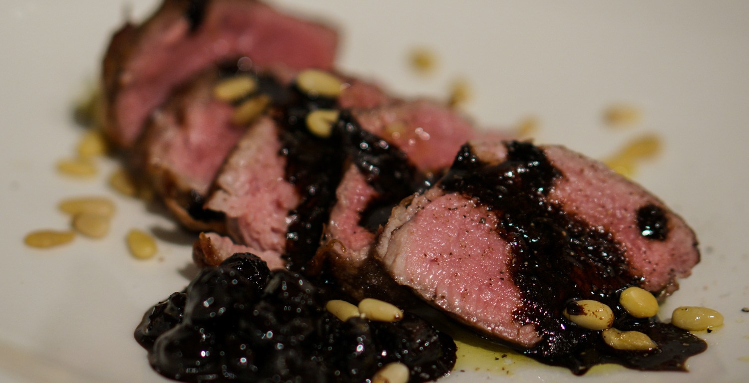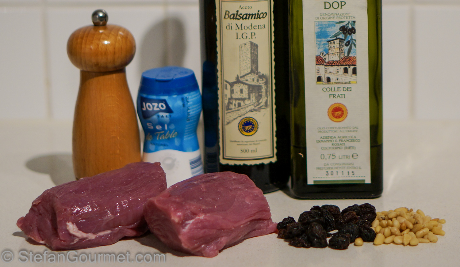 The sauce is a balsamic reduction with raisins and pine kernels, using the browned bits in the pan from searing the meat for added flavor. For the balsamic reduction it is very important that you use a balsamic vinegar that does not have caramel as a coloring agent. Its only ingredients should be grape most and wine vinegar. (Only grape most is also fine, but using such high quality aceto balsamico tradizionale would be a bit of a waste for this.) This is because the caramel will give the balsamic reduction a bitter flavor. Caramel is already burned sugar, and so when you reduce it the burned taste becomes too strong.