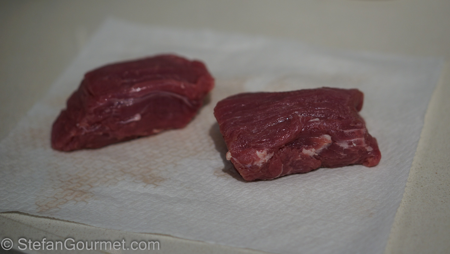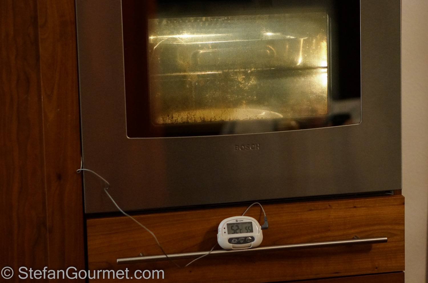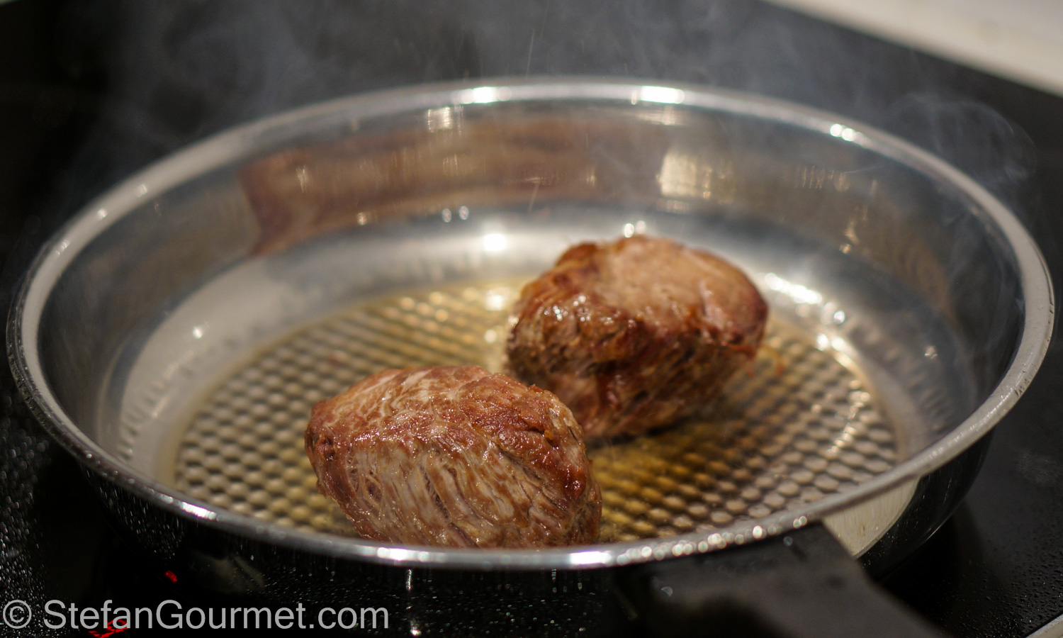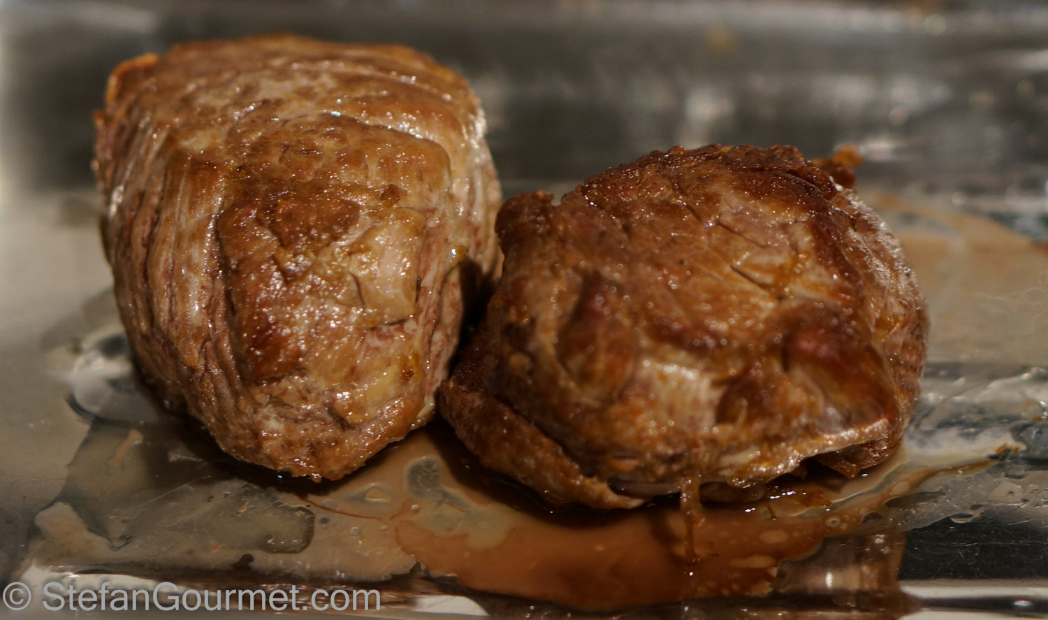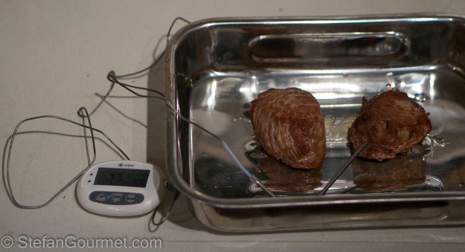 On the picture you can see that the meat is perfectly pink all the way to the edge. That is not only possible with sous-vide, but also with a low oven. In a 100ºC/210ºF oven it takes about 45 minutes to finish cooking the meat this way, but there is no resting time needed so you will save time that way. If you are in a hurry you could cook the meat in a hotter oven in 10-15 minutes, but then you’d need to let it rest for at least 10 minutes and the meat will end up with a ‘doneness gradient’, meaning that the outside layer will be overcooked and only the center will be perfect.
