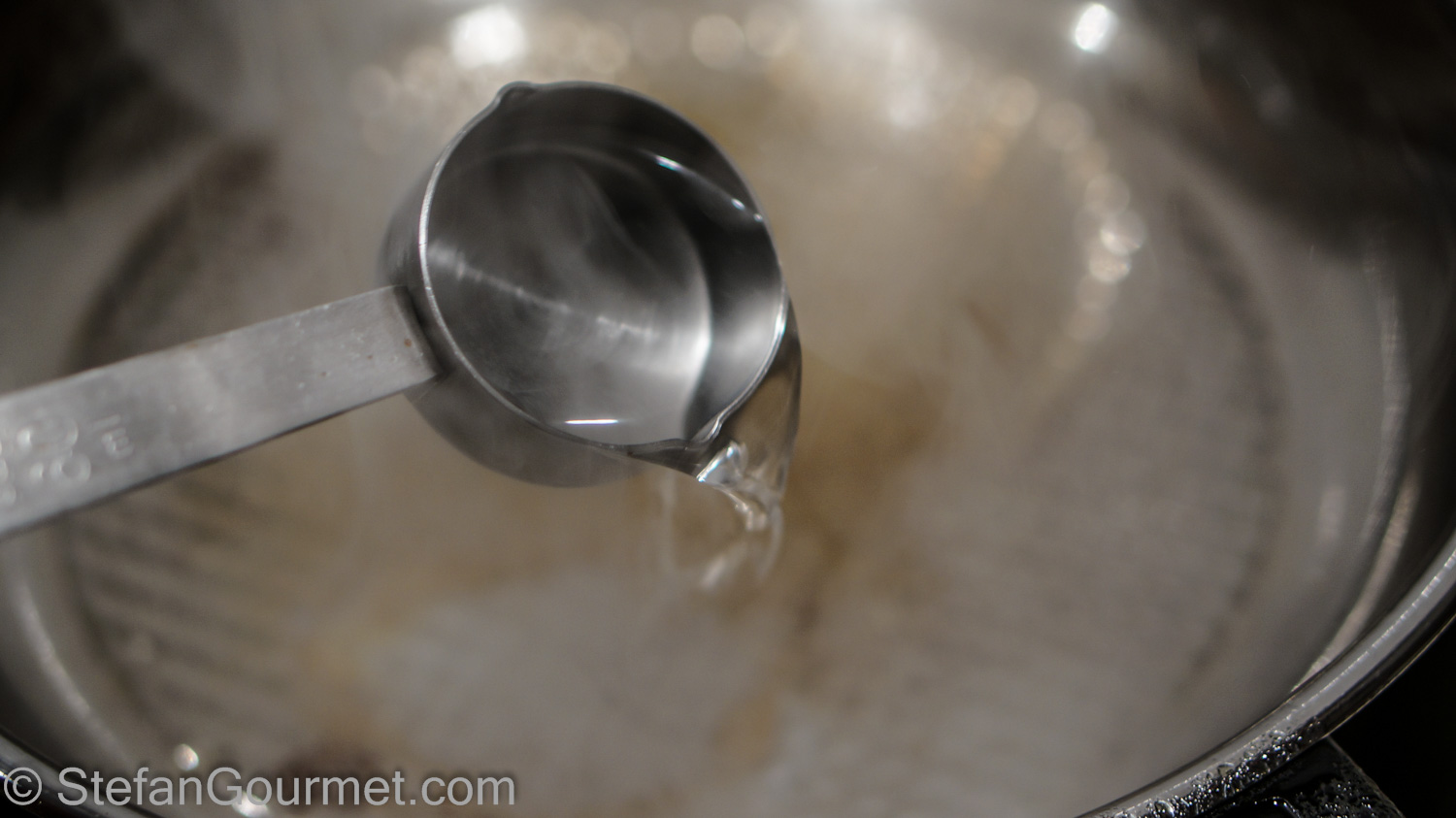Deglaze the pan with the water or white wine, scraping with a wooden spatula to include all the browned bits left from searing the pork.