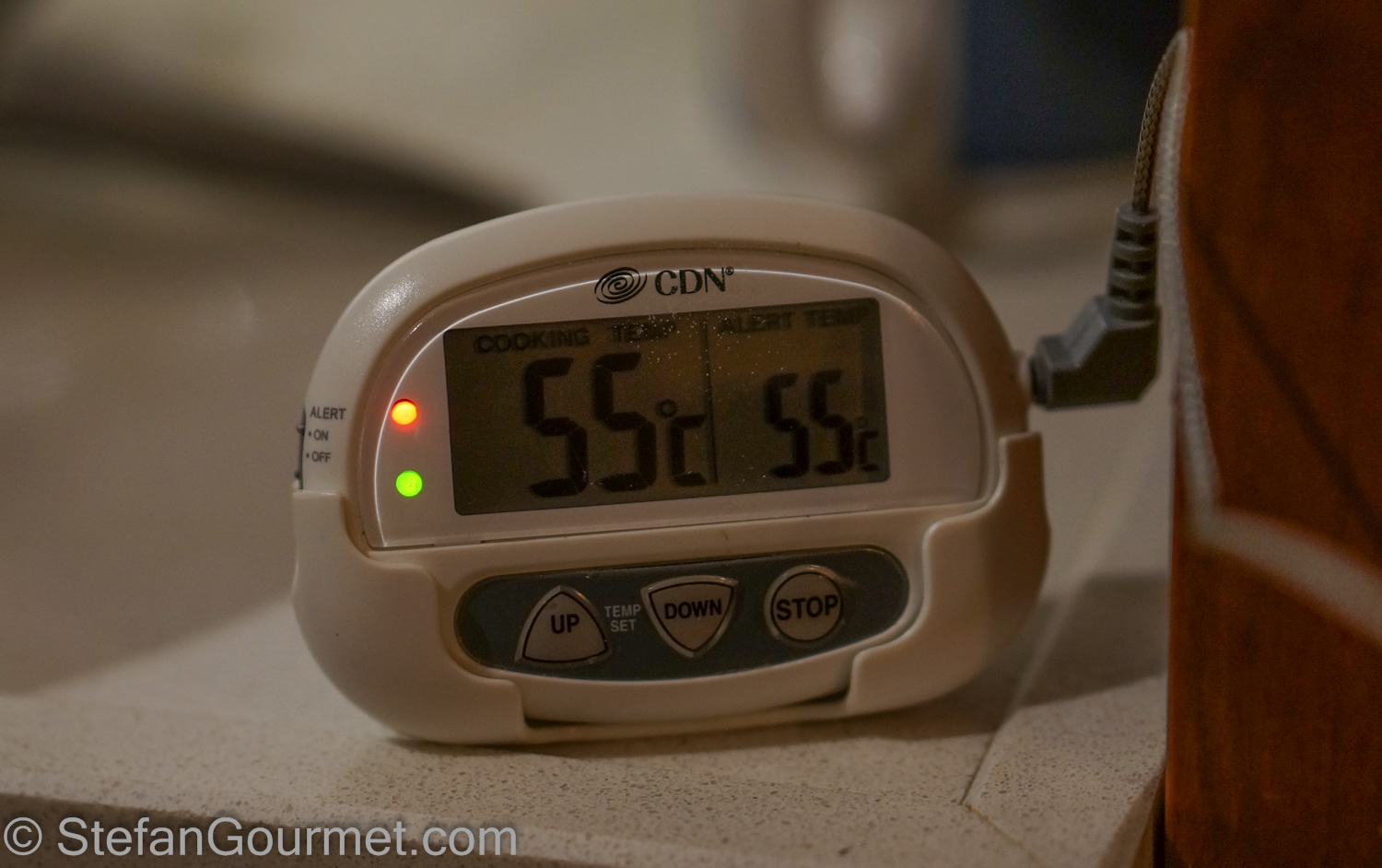 Put the dish with the pork in the oven at 100ºF/210ºF and keep it there until the thermometer reads 55ºC/131ºF for medium rare or 60ºC/140ºF for medium.