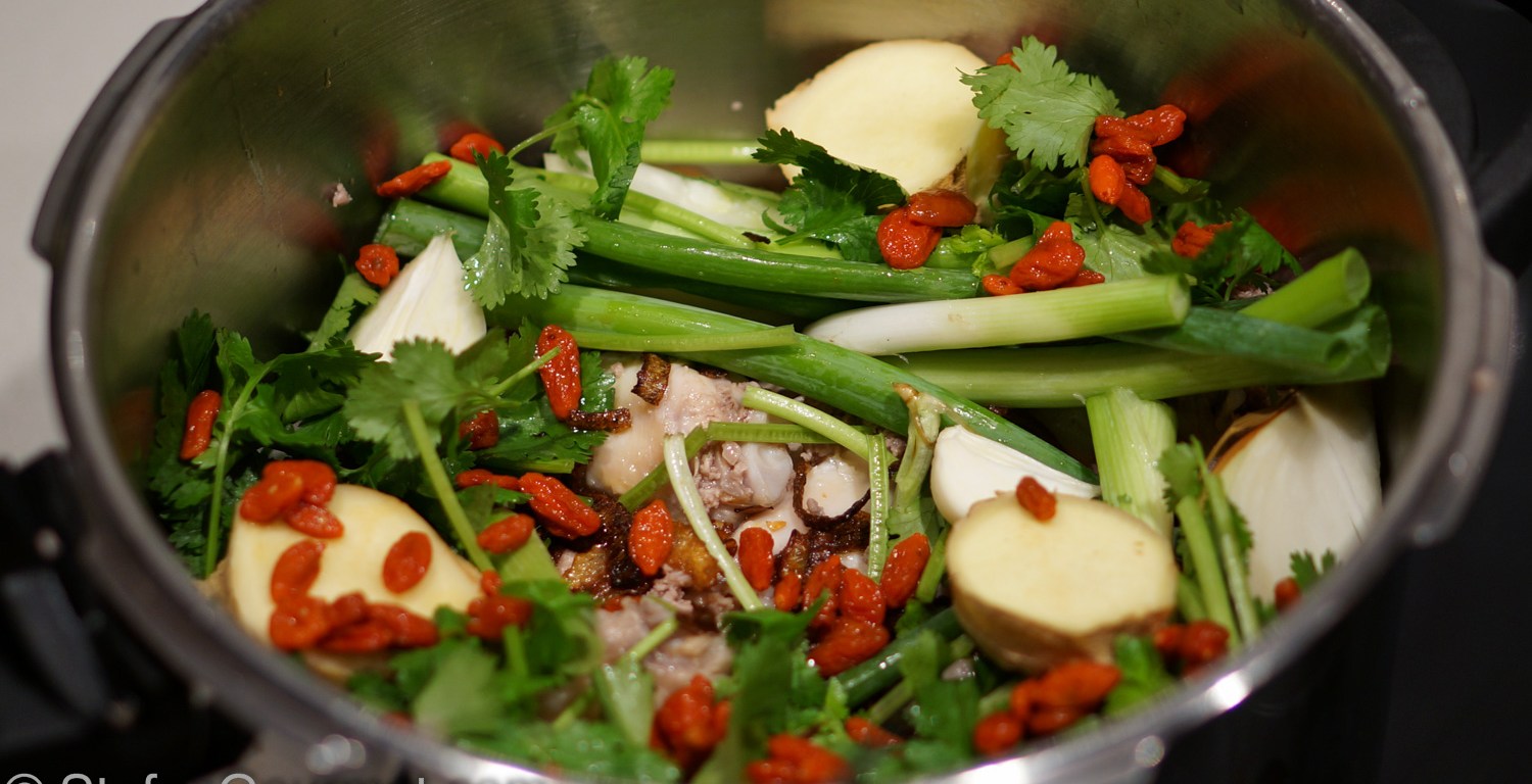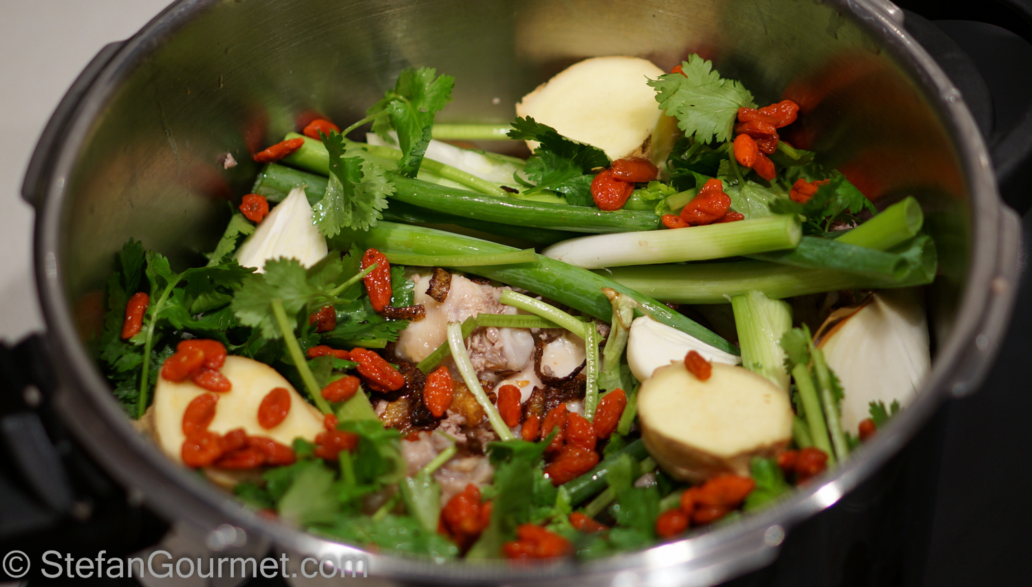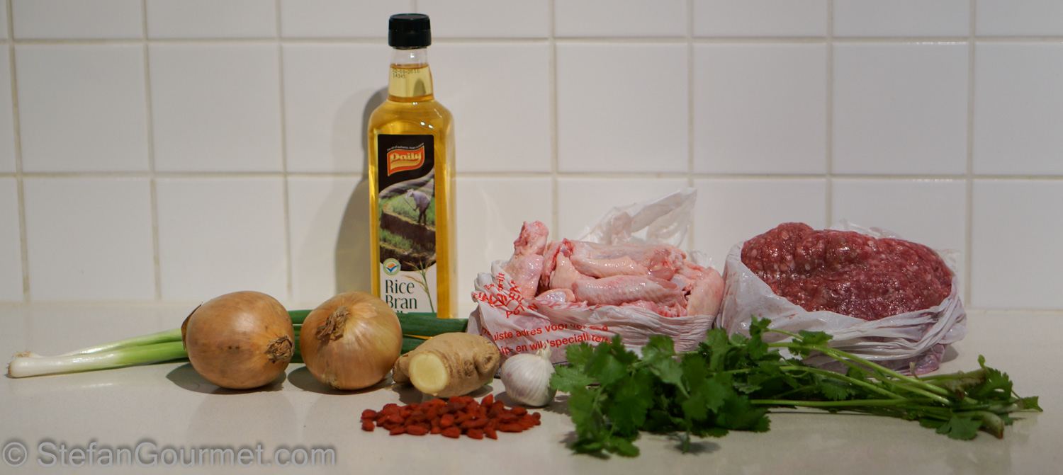 Put the blanched chicken wings and ground chicken in a pressure cooker or large stock pot. Add the quartered onion, 2 Tbsp fried onions, sliced ginger, whole garlic cloves, chopped scallions, chopped cilantro, and drained goji berries/boxthorn seeds.