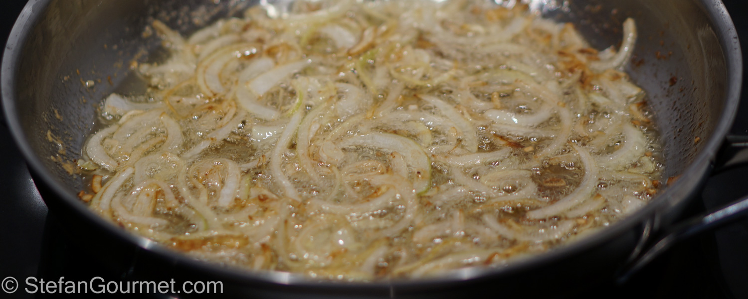 Continue to cook over high heat until the onions start to color. Then lowe the heat to medium.