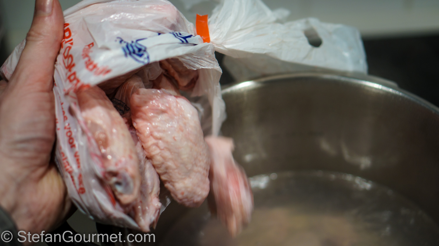 Bring about 2 litres (2 quarts) of water to a boil. Add the chicken wings…