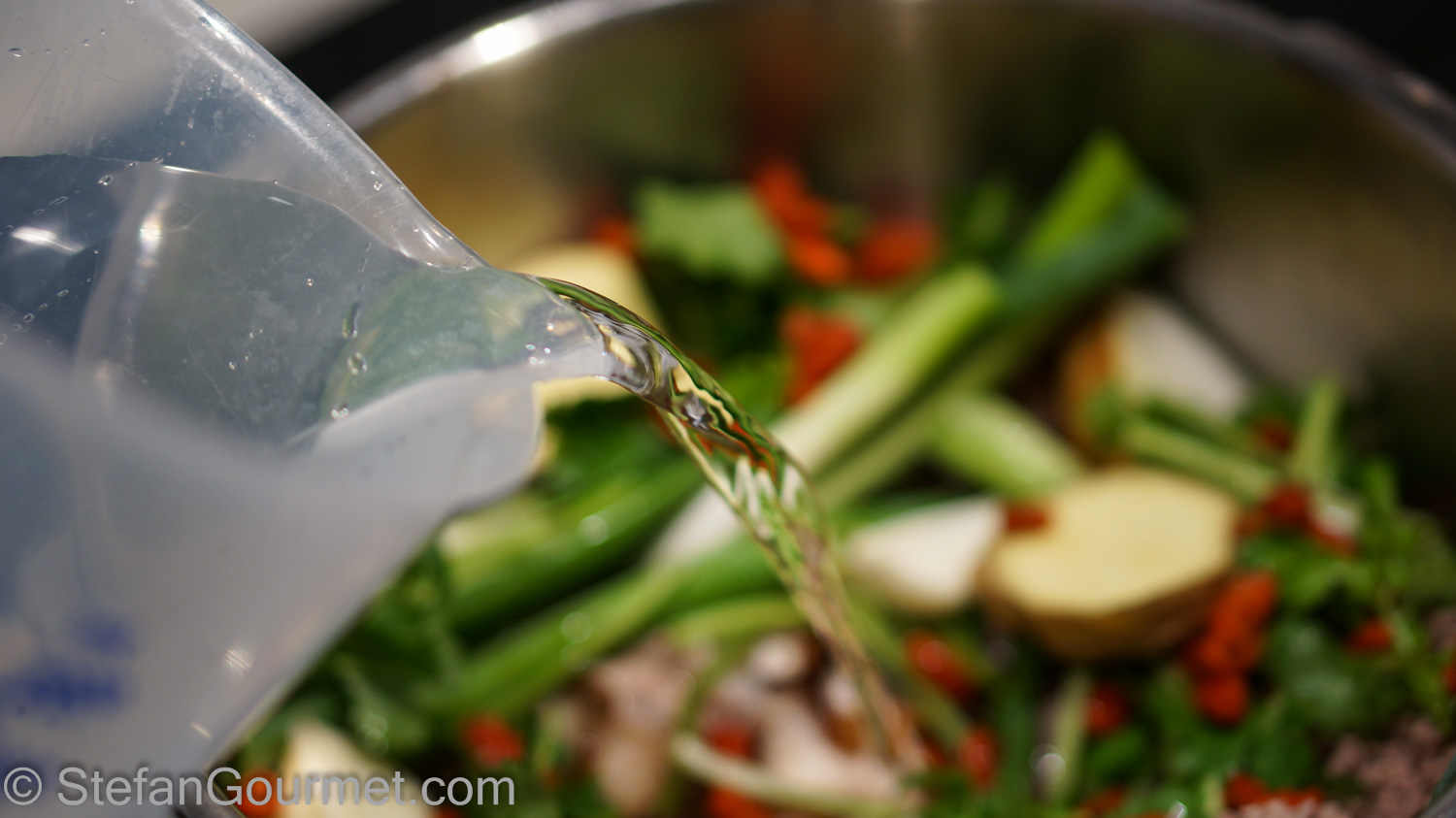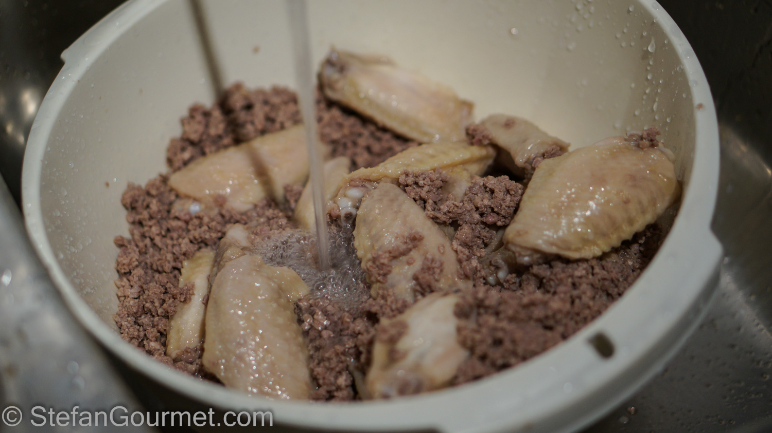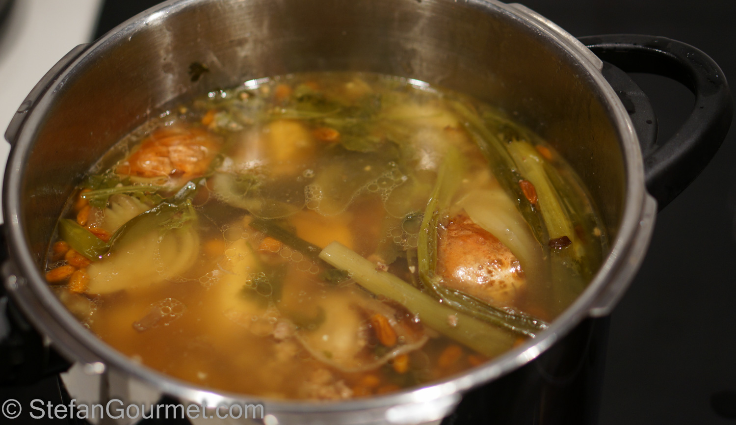 Traditionally Chinese chicken stock is made using a whole chicken, but for better flavor extraction I used chicken wings and ground chicken instead. There are two differences between Chinese chicken stock and ‘European’ chicken stock: for Chinese chicken stock the meat is first blanched, and the aromatics are different: ginger, garlic, cilantro, scallions, fried onions, and goji berries (also known as boxthorn seeds). To save time and achieve better flavor extraction I pressure cooked the stock; if you don’t own a pressure cooker a traditional simmer is fine too. It will just take twice as long. To make 2 litres of stock, you will need a pressure cooker with a 6 litre capacity.