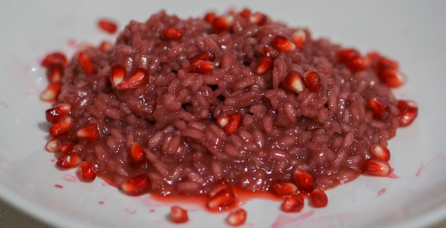 Serve the pomegranate risotto on preheated plates, garnished with pomegranate arils.