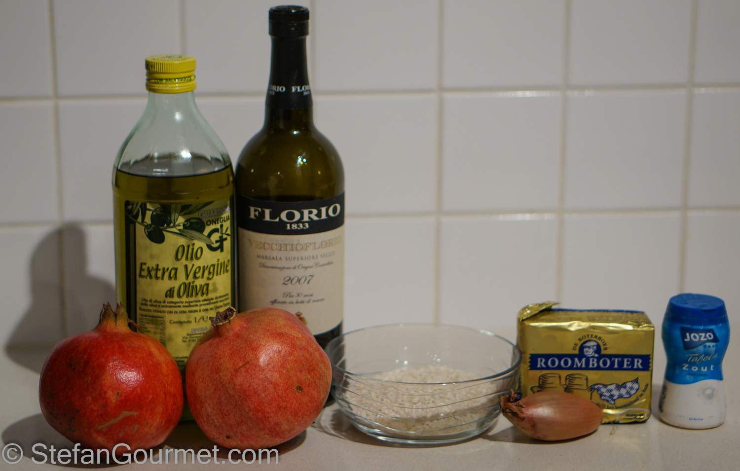 As pomegranates are back in season, this was a good time to try this recipe. I overdid it a bit with the pomegranate juice, as you can see when you compare the color of my risotto to Marina’s. In the recipe below I have included less pomegranate juice then I used and in fact as much as I will use next time I prepare this. If you like pomegranate, you will love this risotto!