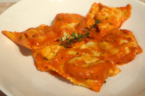 A bit over two years ago I also posted a seafood pasta dish with a pink sauce, but this one more elaborate: ravioli with smoked salmon.