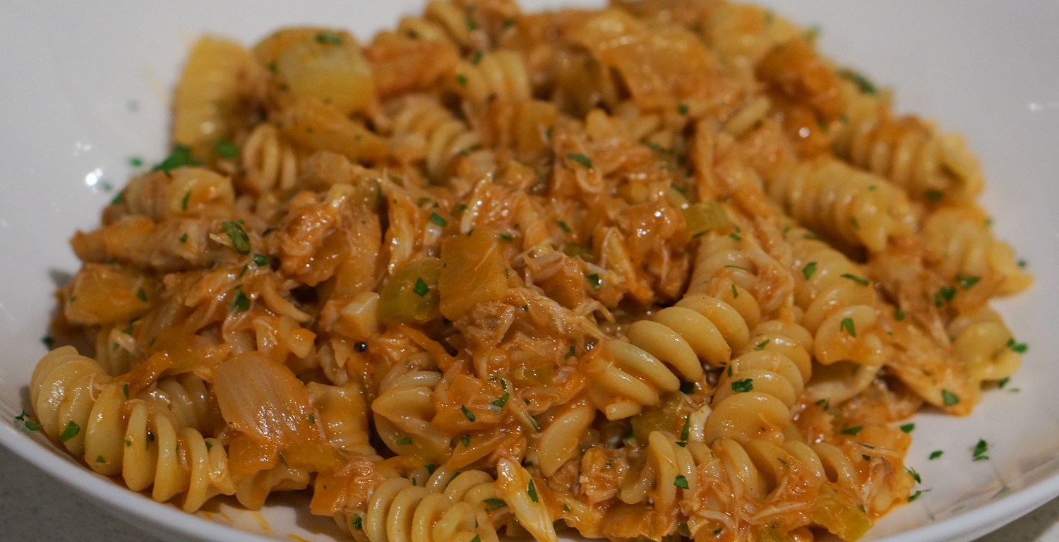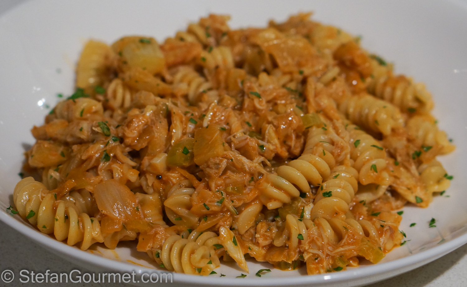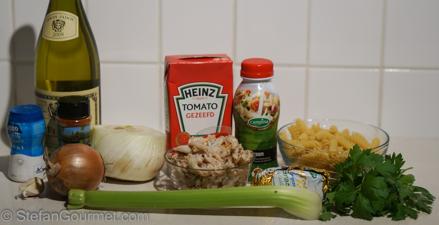 Although crab and fennel are perhaps not ingredients you use on an every day basis, this is one of those pasta dishes that can be prepared in half an hour and is thus perfectly suited for a weekday meal. That is, if you use crab meat that has already been picked out of the claws (as I did in this case). The crab and fennel are paired with onion, celery, garlic and a pink sauce of white wine, sieved tomatoes, cream, and cayenne pepper. This gives the dish great depth of flavor and makes it taste very special for a weekday dish that can be prepared in half an hour. The fennel and fusilli pasta provide a nice texture. Here’s what I did…