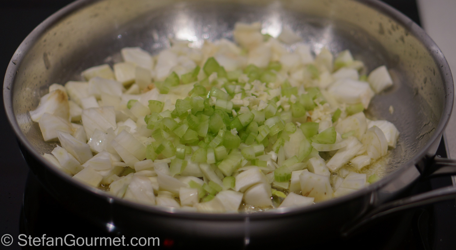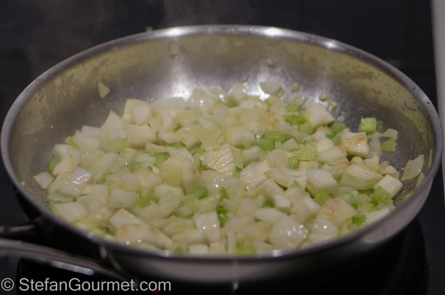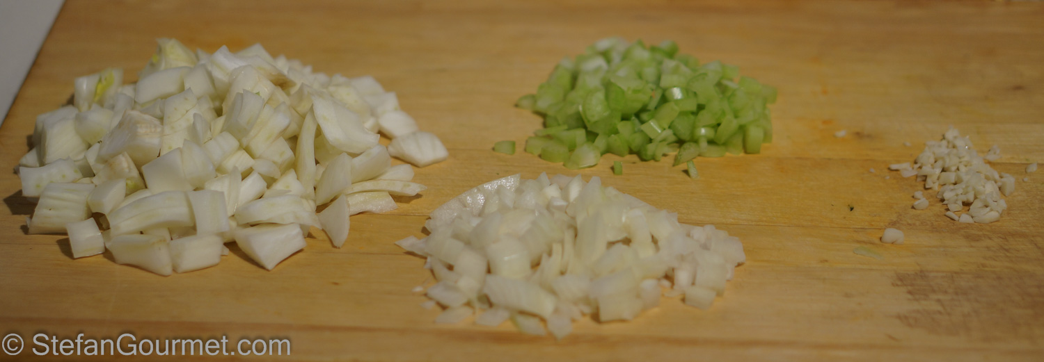 Remove the fronds, bottom, and tough core of the fennel, and dice it (1 cm or 1/2 inch dice). Mince the garlic. Dice the celery and onion (small dice, 1/2 cm or 1/4 inch).