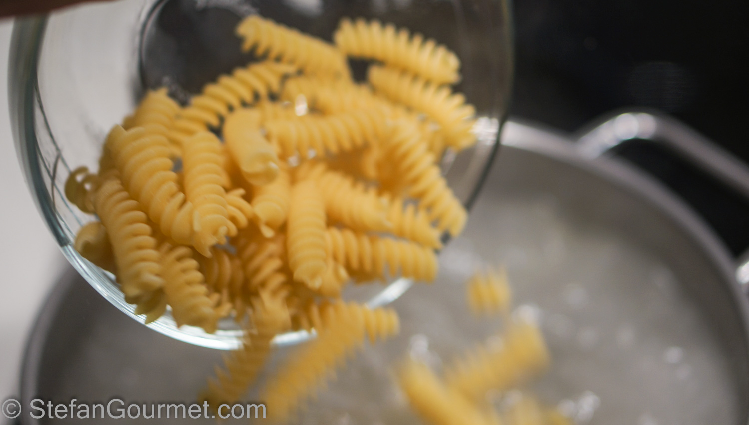Meanwhile, bring a pot of water to a boil. Add salt and fusilli, and cook al dente according to package instructions.