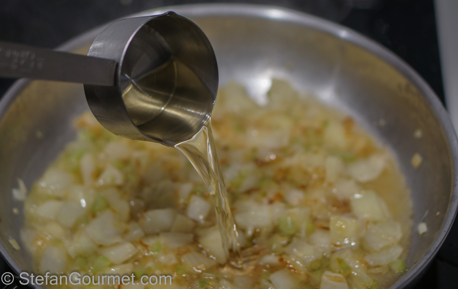 When the fennel is cooked but still has some bit, add the wine and cook stirring, until half of the wine has evaporated.