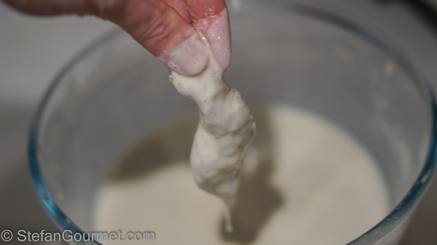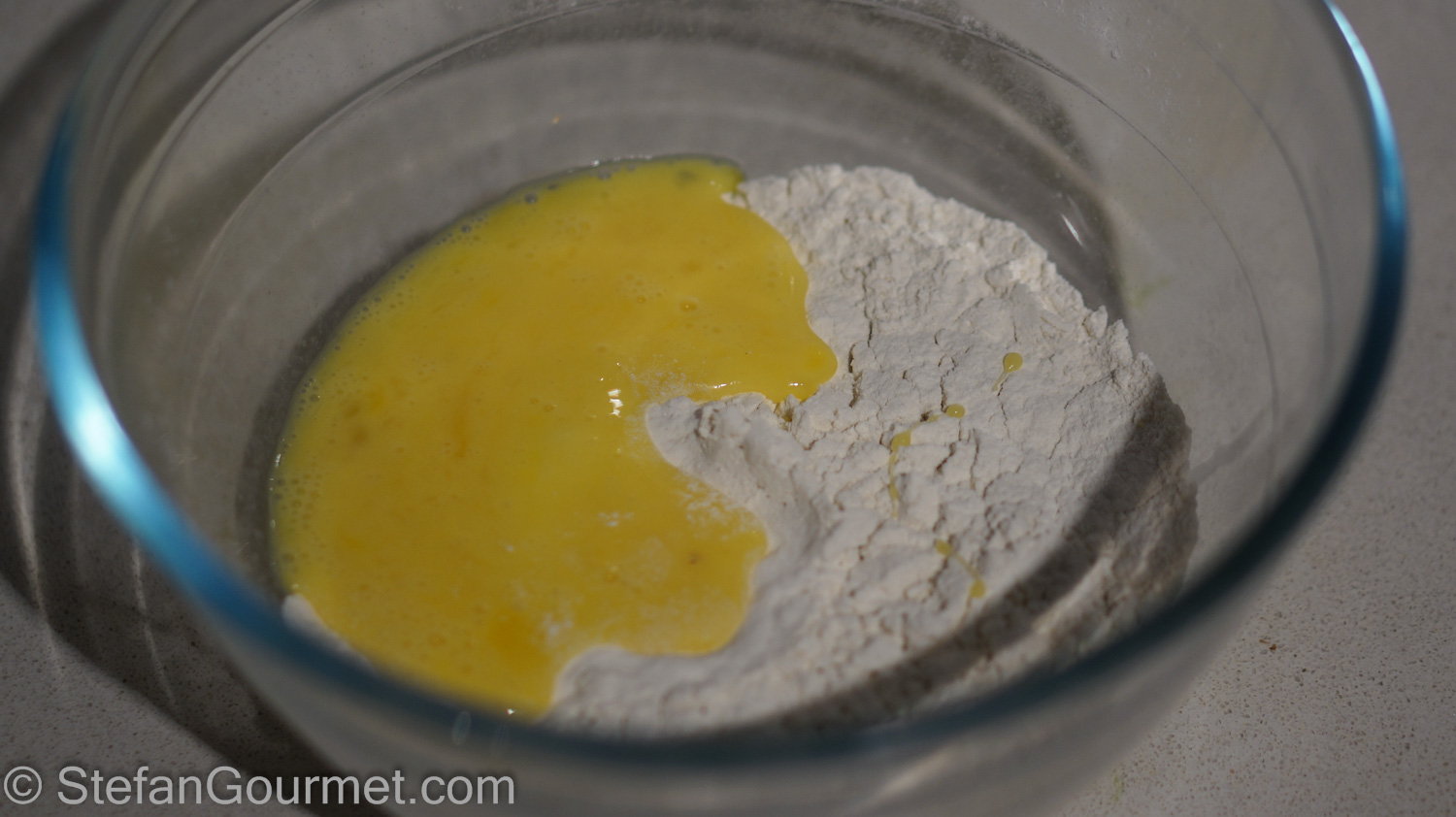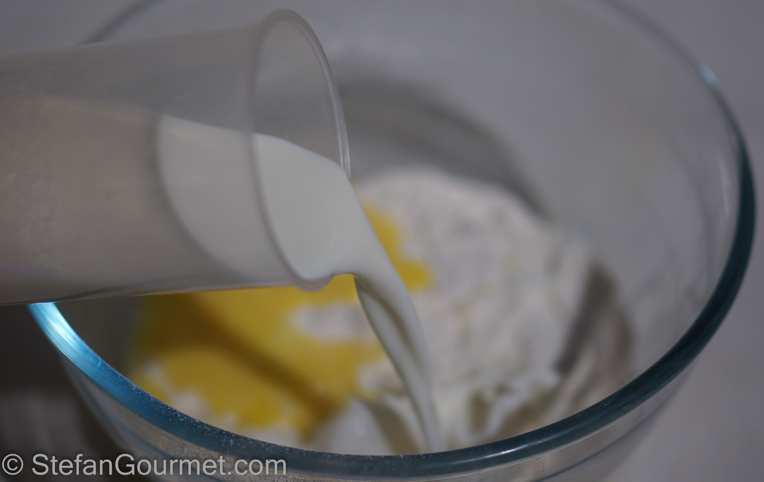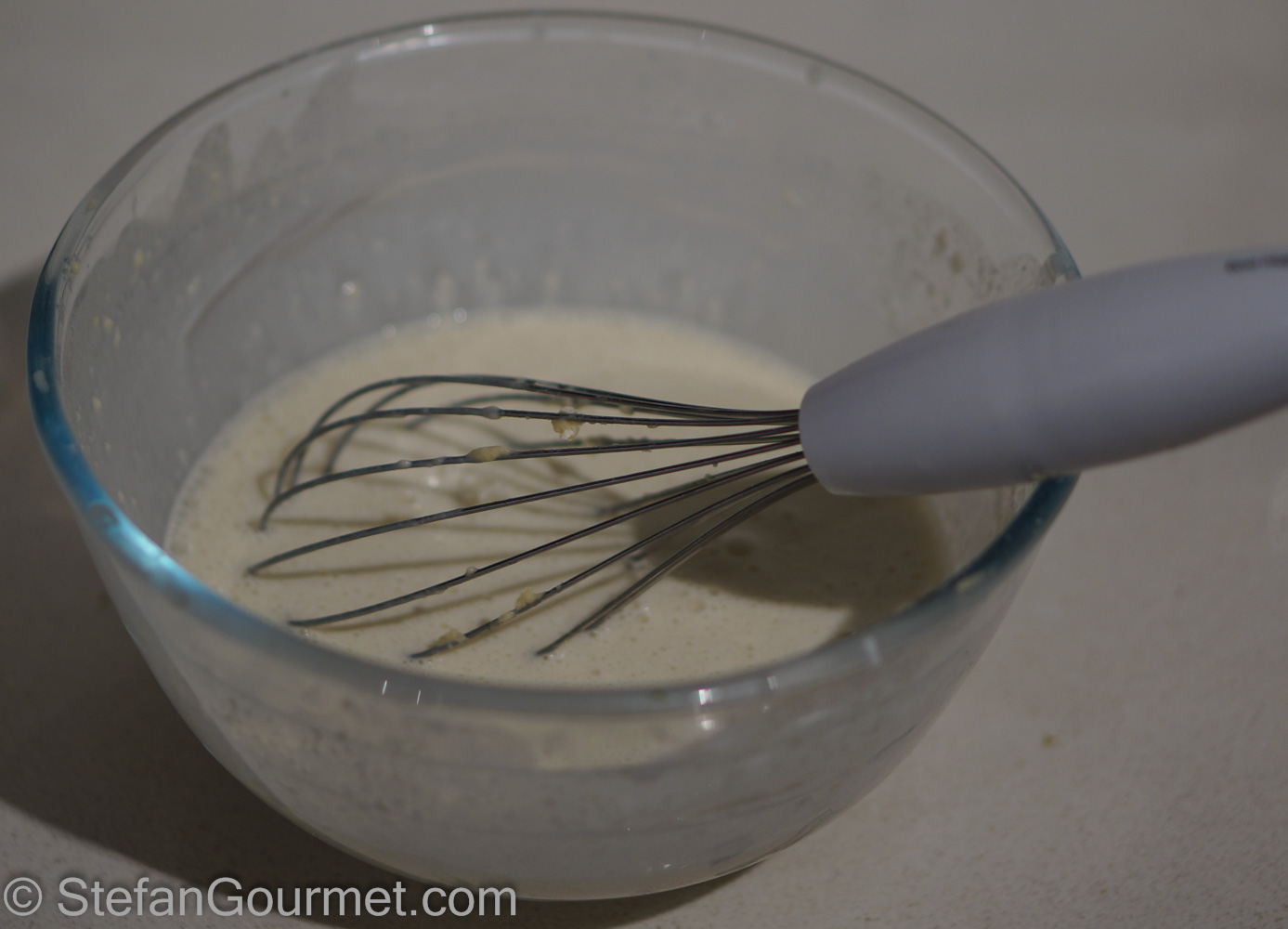 …and whisk until smooth. To prevent lumps, it helps to add only half of the milk first and then slowly add more milk while you are whisking. The batter will be quite similar to that of Dutch pancakes.