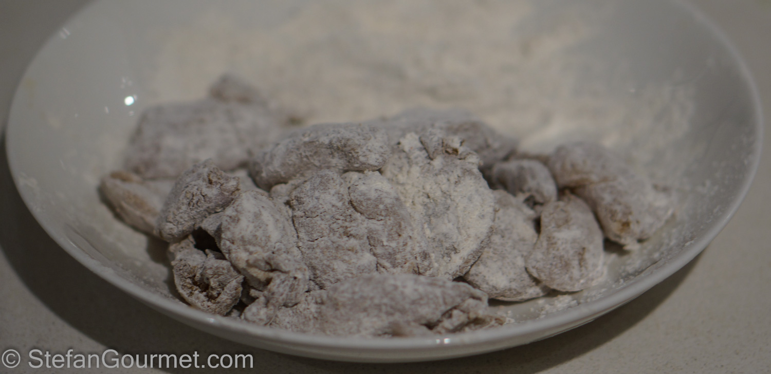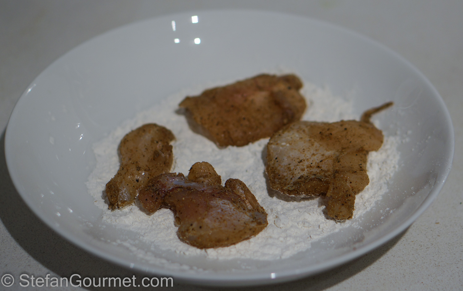 Heat the oil to 180ºC/350ºF. Toss the pieces of fish with flour…
