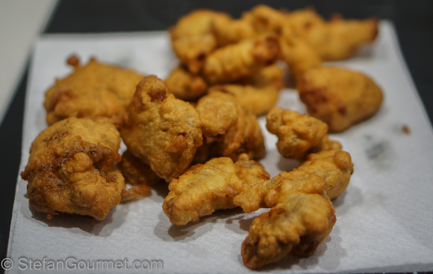The cod cheeks are first seasoned with a spice mix, allowed to marinate, then battered and deep fried, and finally served with a remoulade or similar sauce. The spice mix reminds me a bit of cajun cuisine.