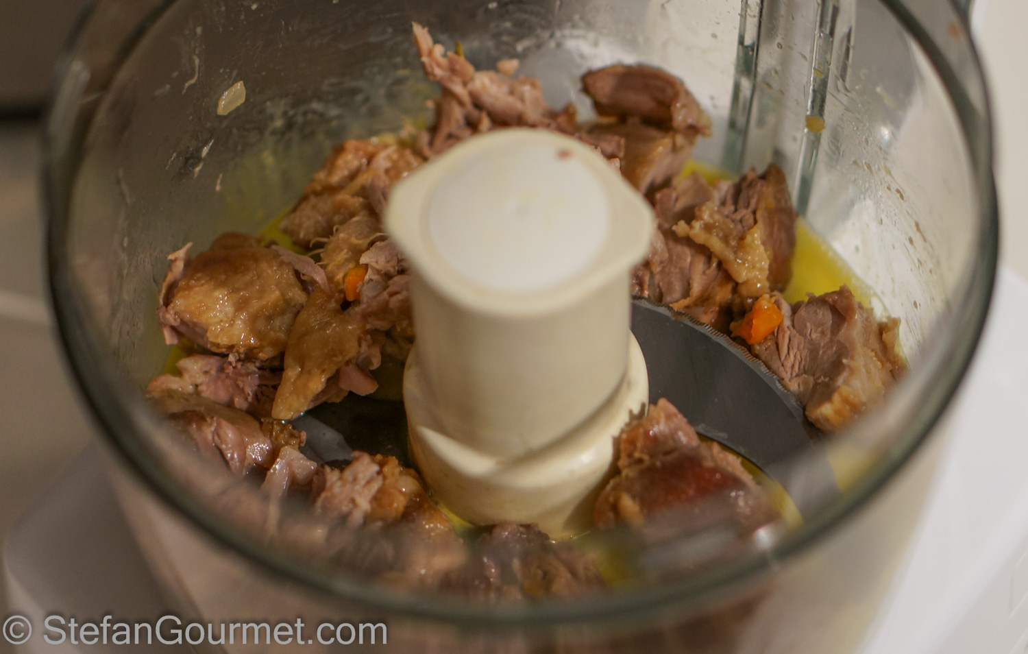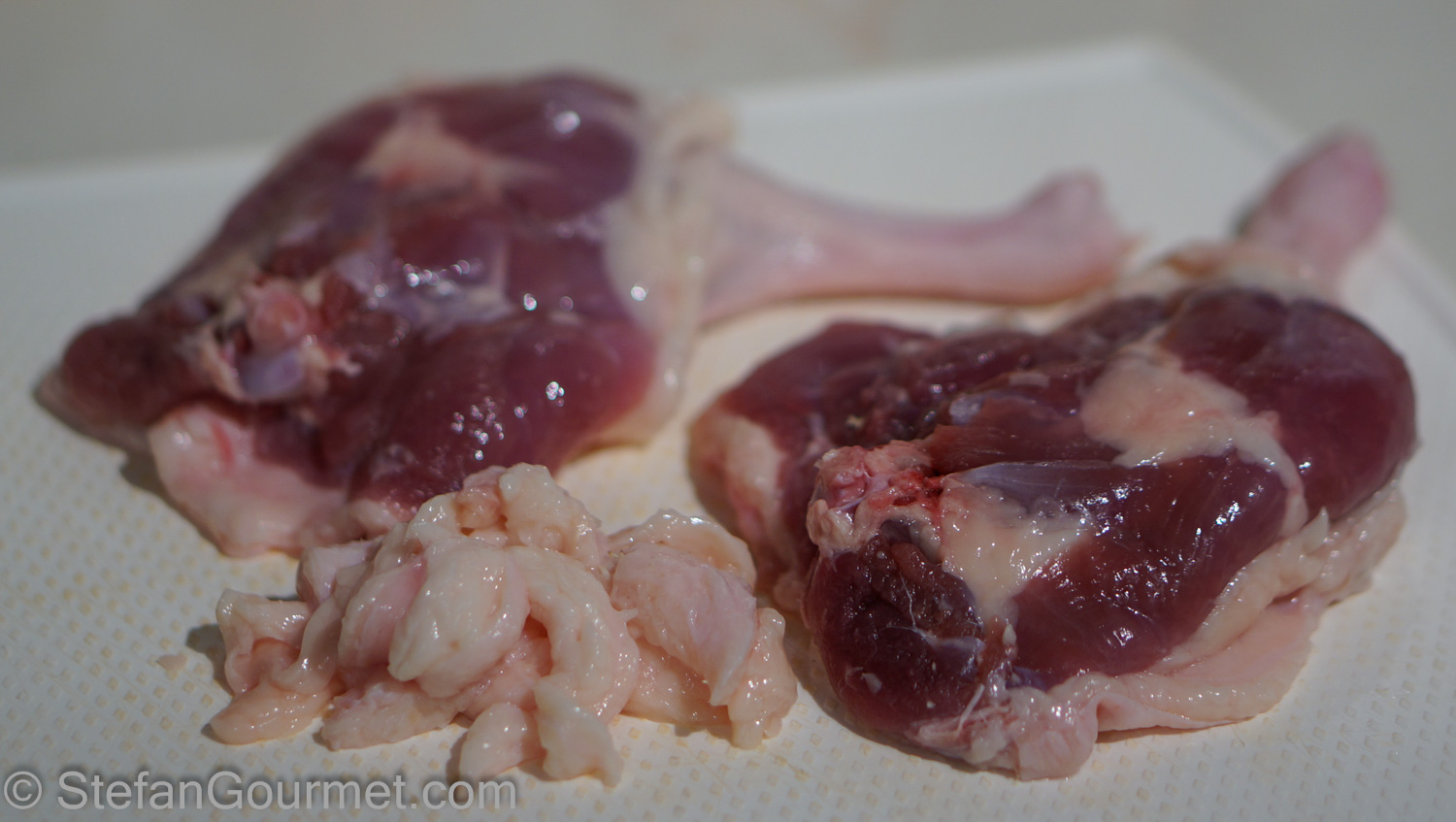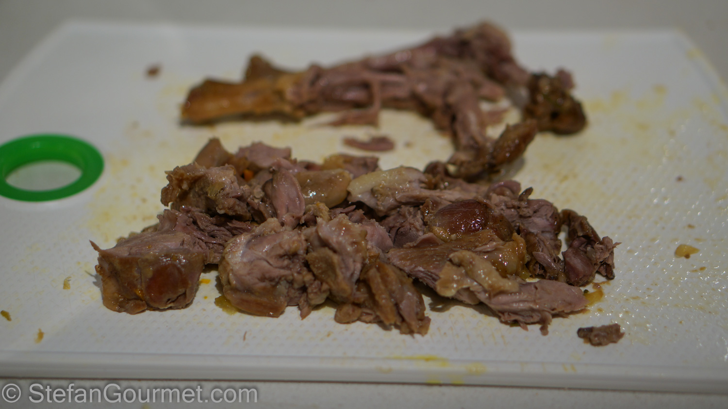 Allow the duck legs to cool off a little so you can handle them, then take the meat off the bones (this is easiest if you have simmered the duck legs until the meat falls off, obviously), including the skin. Reserve the bones.