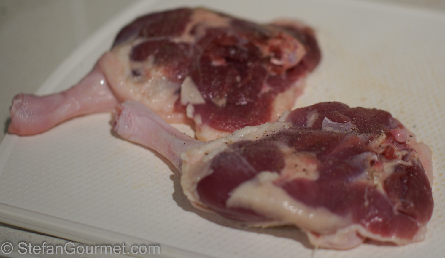 Season the duck legs on all sides with salt and freshly ground black pepper.