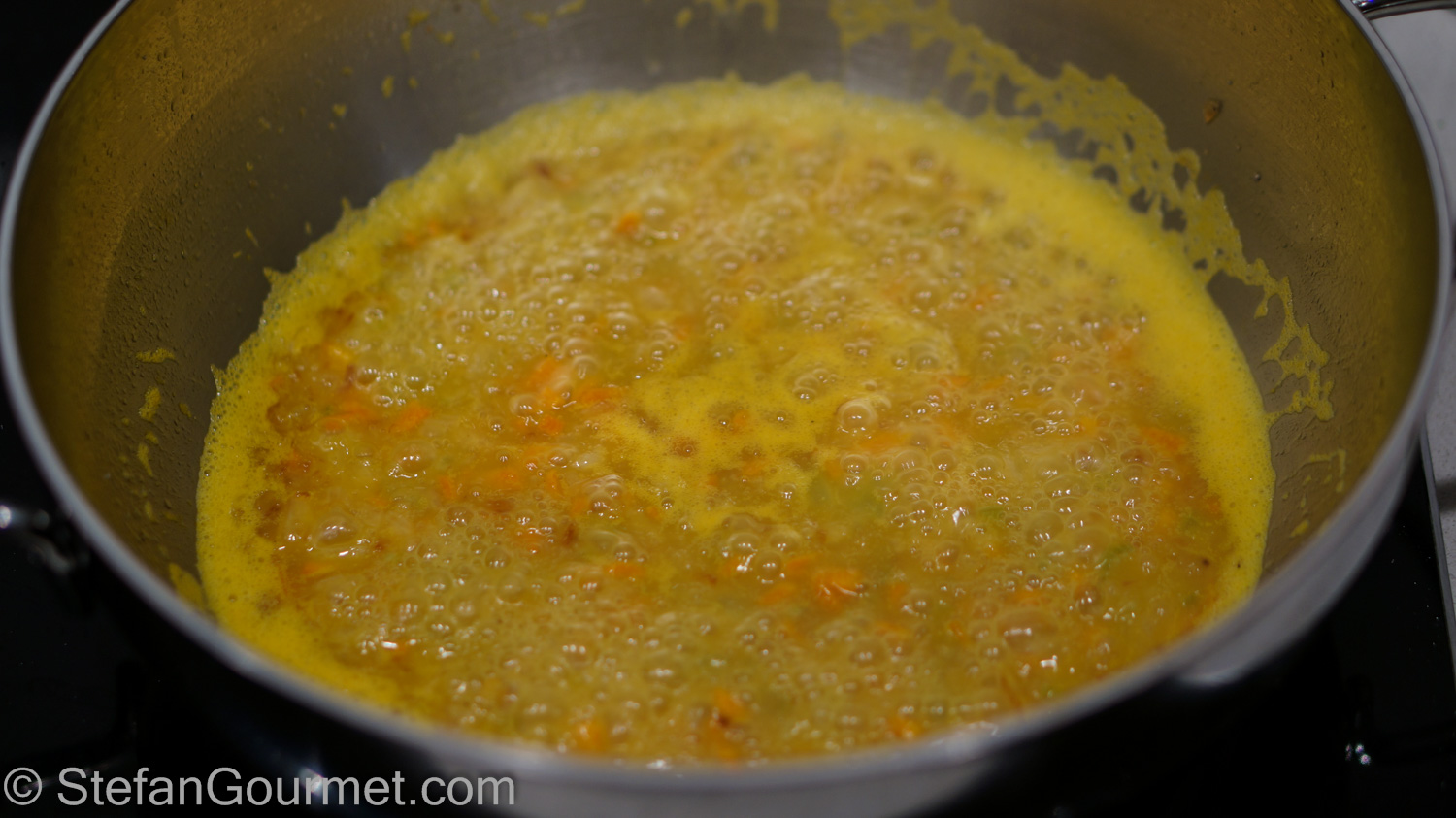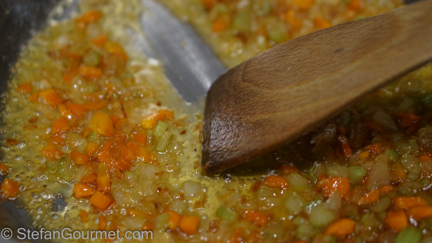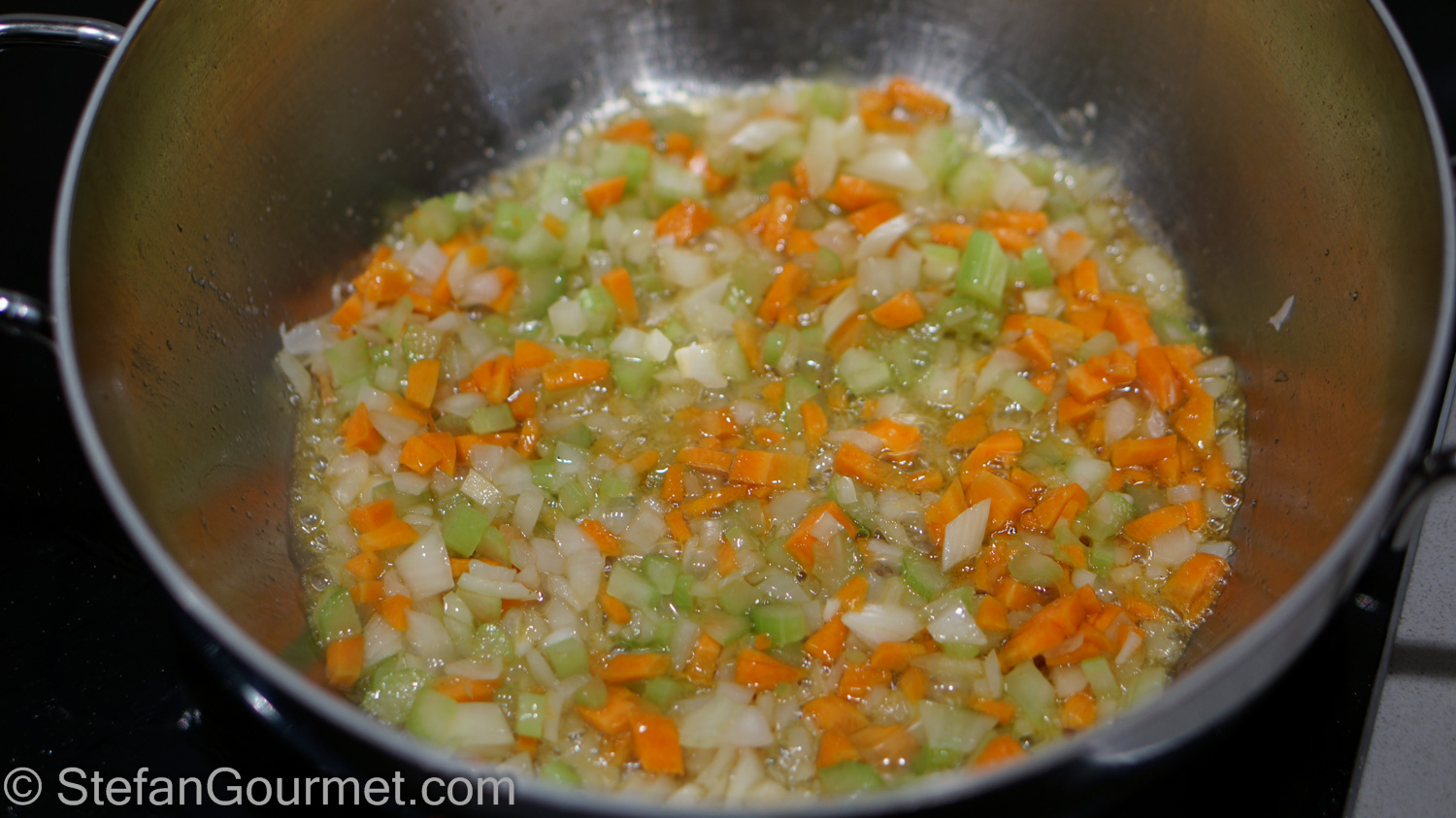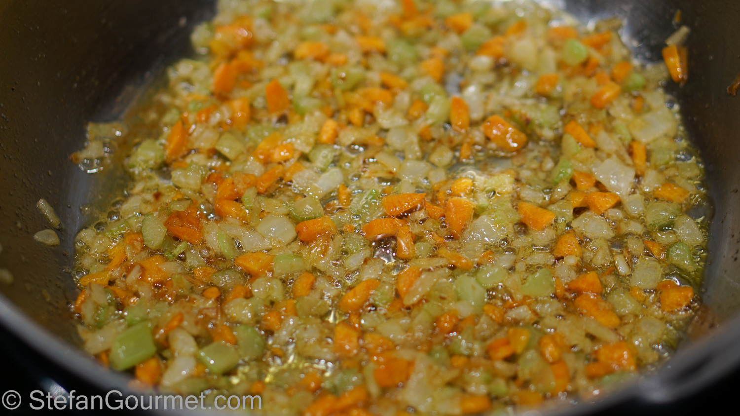 Sauté the onion, celery, and carrot in the duck fat over medium heat.