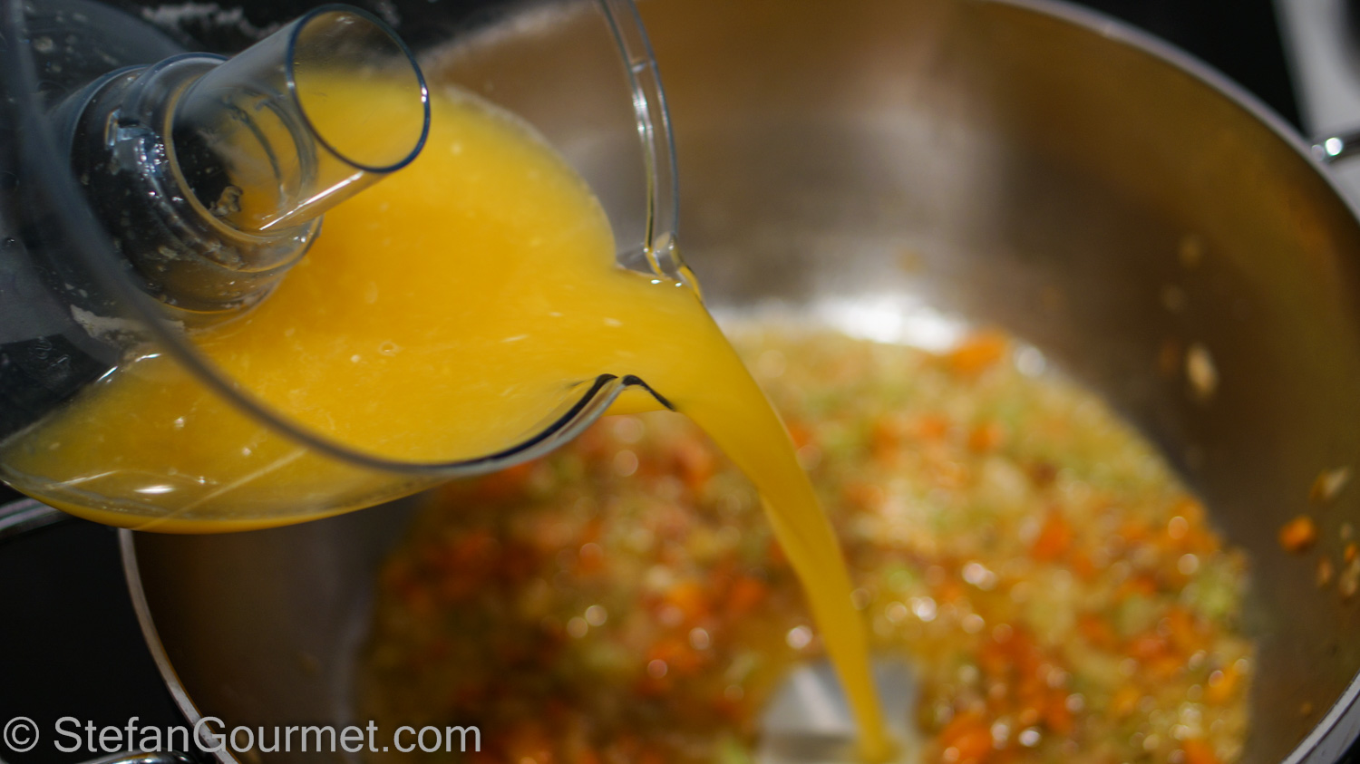 Meanwhile, squeeze the orange (remembering to zest 1 first, as it is difficult to zest a juiced orange).